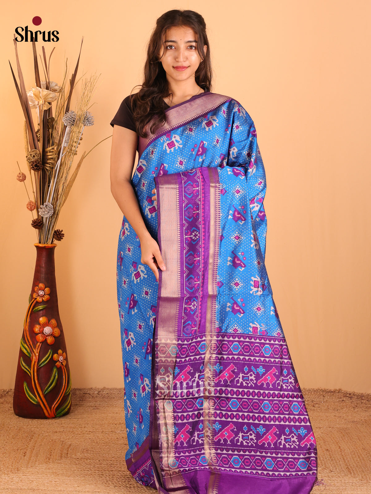 Pretty Blue Semi Patola Saree features a intricate patola patterns on the full body . Adding to its elegance are the Purple Rettaipet zari woven borders and a patola pattern pallu, all complemented by a contrast blouse with zari border.