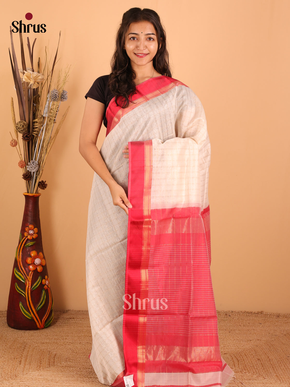 White & Red - Maheswari silk cotton Saree - DCS27254