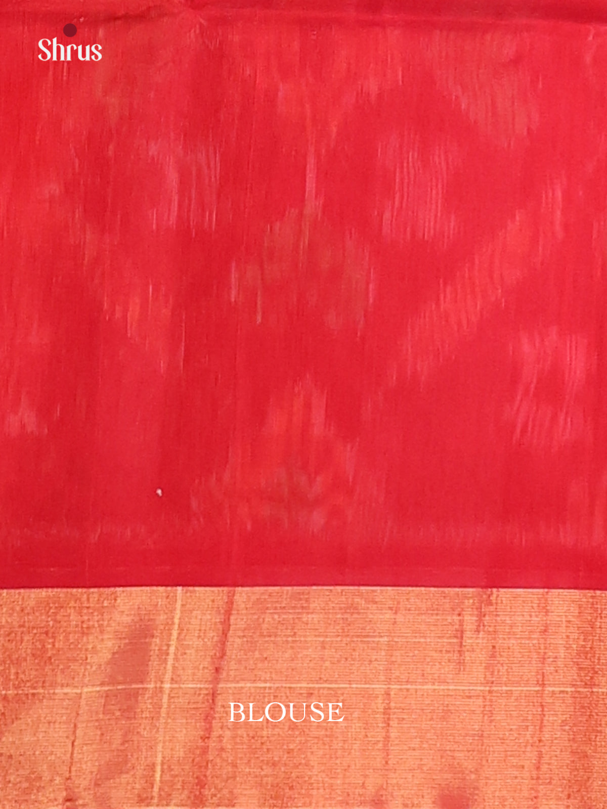Pretty Chutney green Pochampally silk cotton Saree showcases intricate ikat patterns that exude sophistication. The saree features a stunning contrast Red double-sided border and pallu, adorned with ikkat floral motifs. The ensemble is complemented by a Plain Red blouse with matching border.