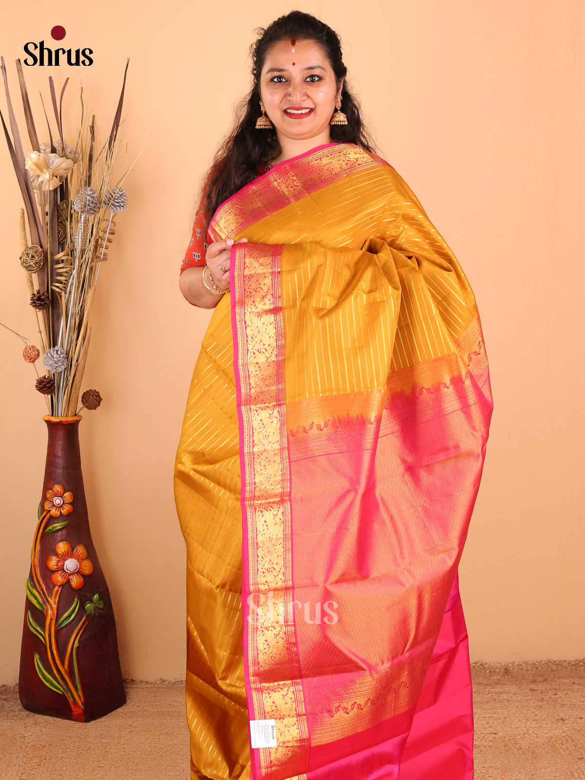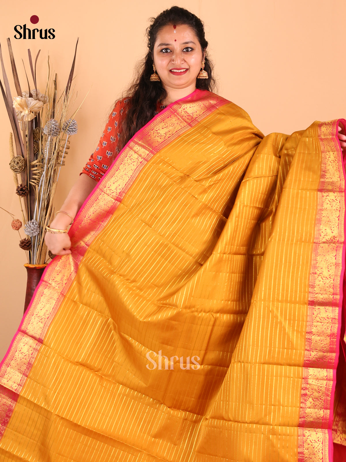 Glorious Mustard Kanchipuram silk Saree with zari stripes & Maroon Zari Border