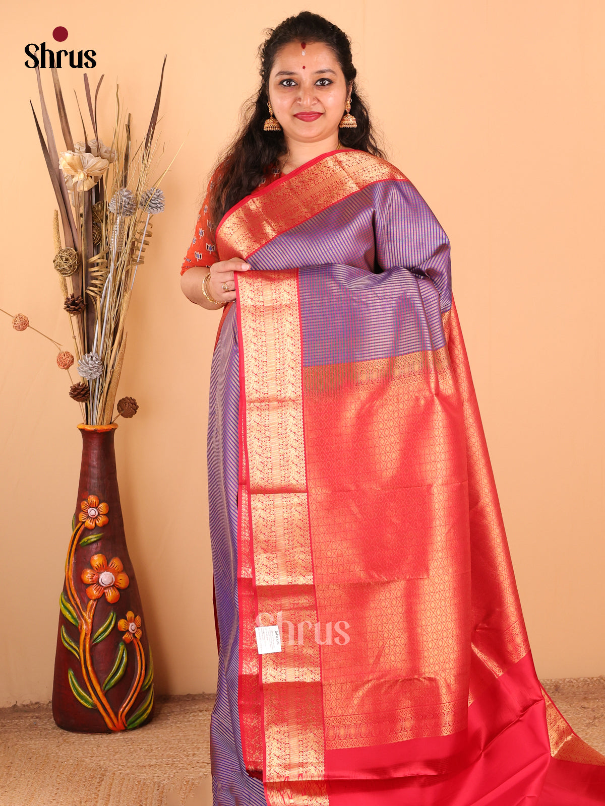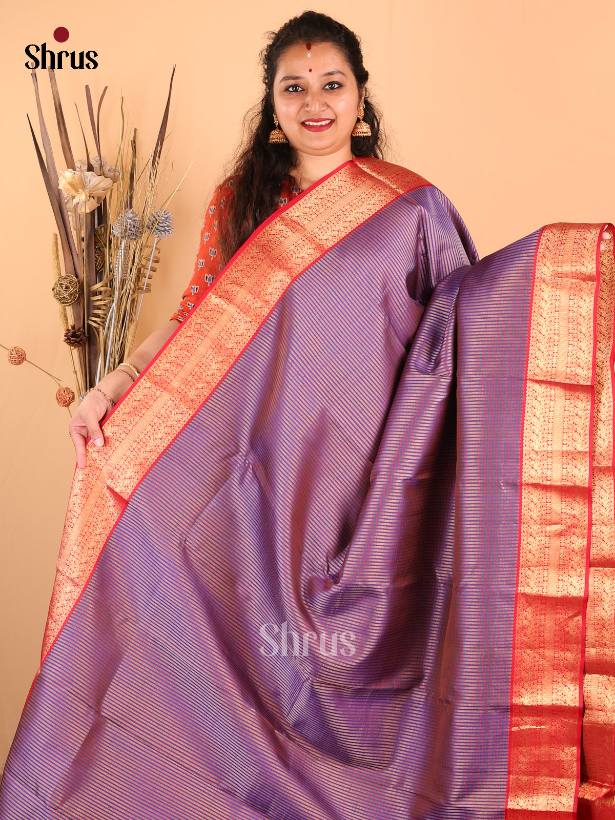 Adorn yourself in the timeless elegance of this Dazzling Violet Original Kanjivaram Saree, meticulously crafted from pure silk for unmatched luxury. This exquisite Kanchipuram silk saree features intricate zari checks woven across the body, exuding regal charm. The bold Red zari border enhances its majestic appeal, while the opulent Red zari brocade pallu, adorned with elaborate motifs, radiates grandeur. Perfect for weddings, festivals, and special occasions, this saree ensures a striking presence.