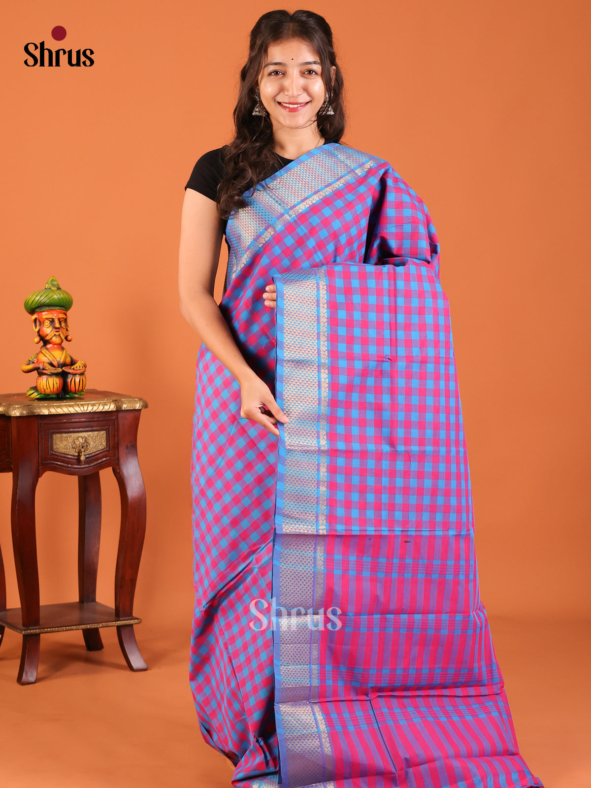Pretty Blue & Pink Chettinad Mix Cotton Saree features beautifully checkered pattern on the body and a contrasting Blue Zari woven border, making it a perfect choice for formal work attire. The striped self pallu adds an elegant touch to the overall appeal.