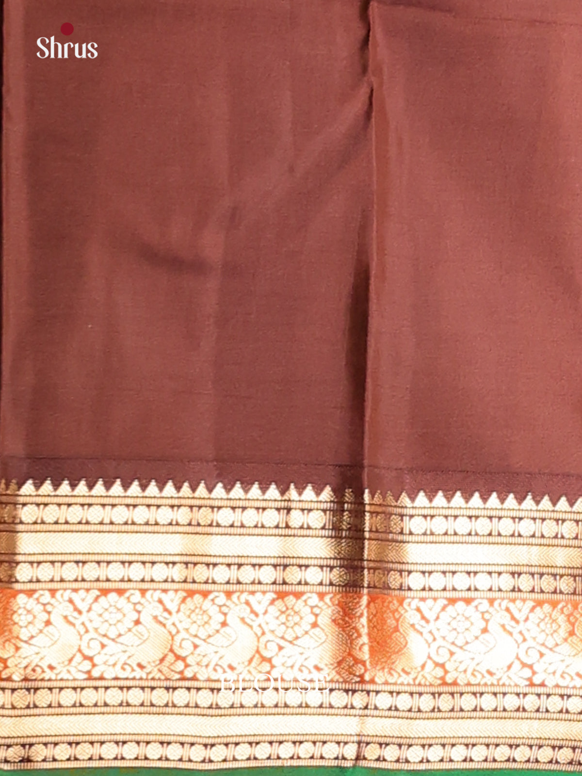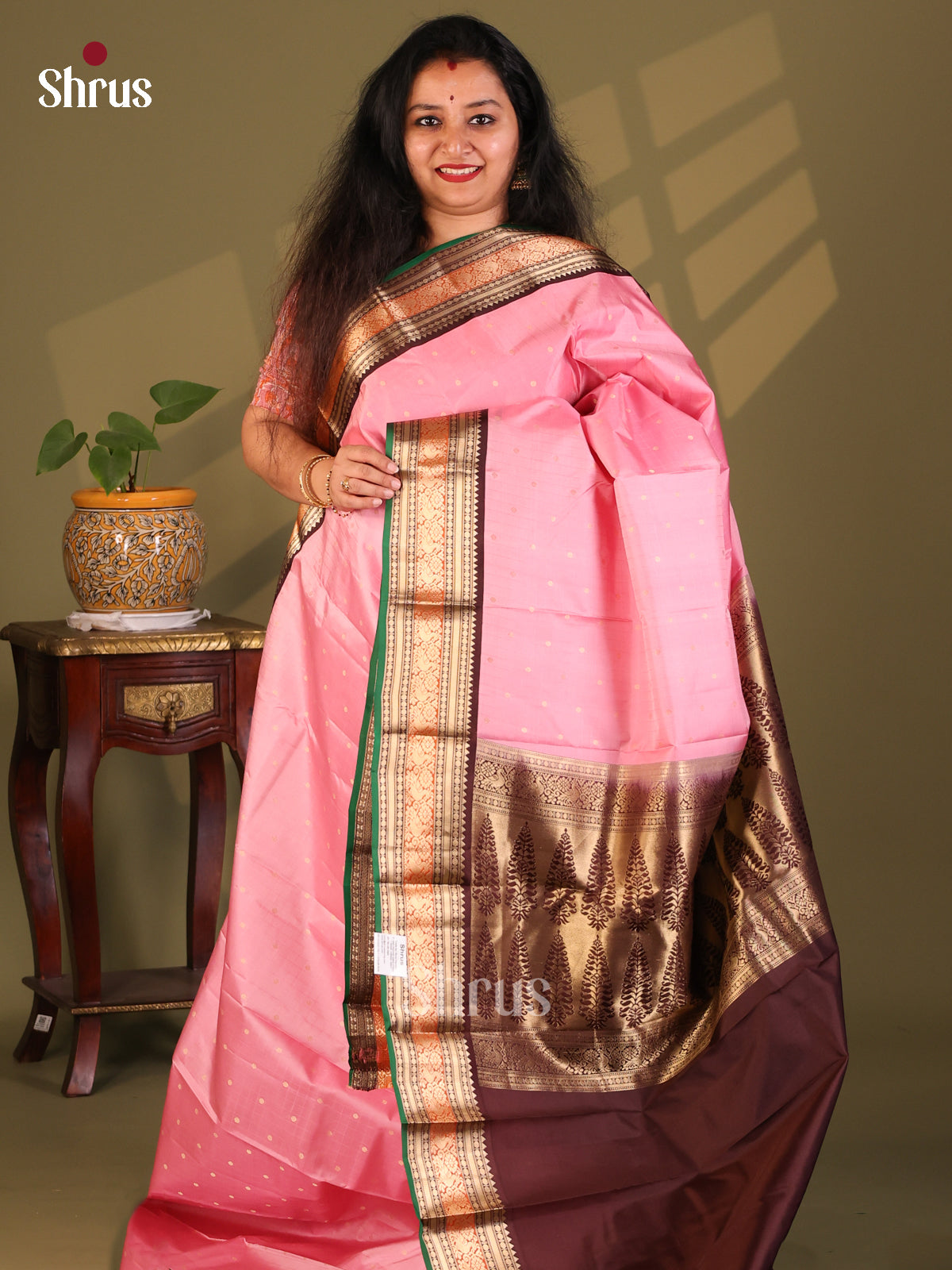 Charming Pink Kanjivaram saree, featuring intricate zari-woven buttas gracefully spread across the body. The splendid Brown zari border adds a striking contrast, enhancing its regal appeal. The brocade zari pallu, rich with intricate detailing, adds a layer of grandeur, making this saree perfect for weddings and festive celebrations. The saree is paired with a Brown blouse featuring a zari border, perfectly complementing the ensemble.