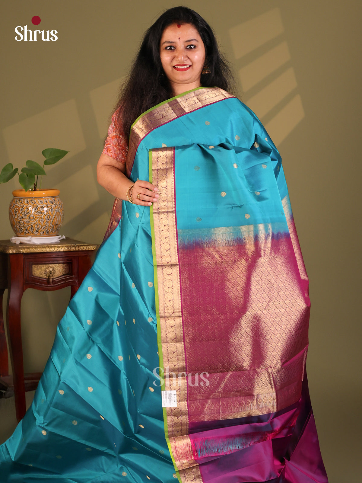 Radiate elegance with this Celestial Blue Kanjeevaram South Indian bridal saree, crafted from pure silk. The saree features exquisite buttas delicately woven in rich zari, adding a timeless charm to the luxurious drape. A striking contrast Purple zari border enhances its regal appeal, while the intricately designed Purple brocade zari pallu exudes opulence. Ideal for weddings, festive occasions, and grand celebrations, this masterpiece reflects traditional artistry and modern sophistication.