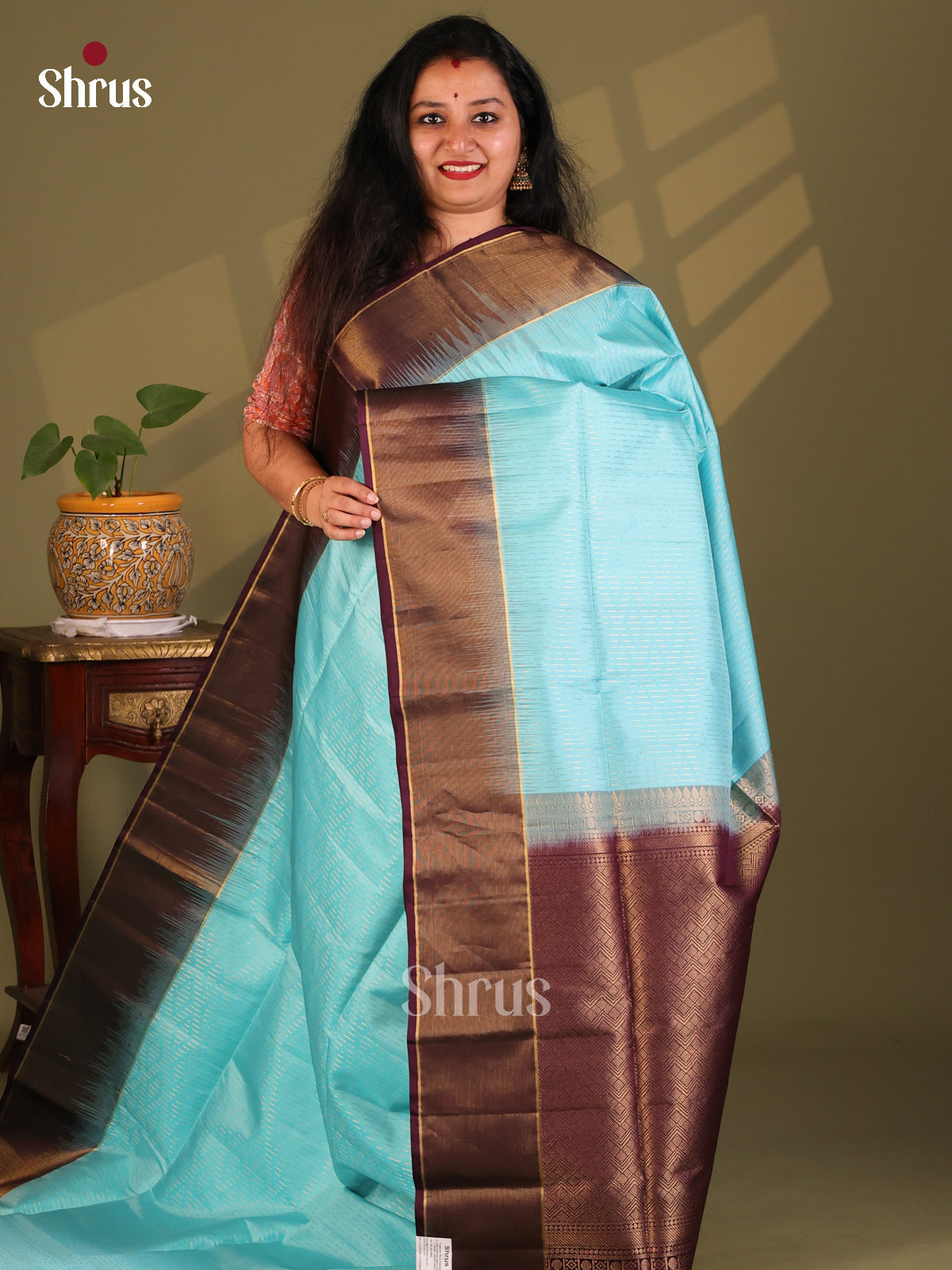 Slip into effortless elegance with this Chic Pastel Blue Soft Silk Saree. Its body is a dream, featuring intricate zari-woven stripes and buttas that shimmer beautifully. A striking contrast arakku maroon zari-woven border frames the saree, adding a touch of vibrant sophistication. This isn't just any saree; it's a weightless silk saree that feels incredibly light and comfortable. The delightful weave extends to the arakku maroon zari-woven brocade pallu, a true masterpiece of design. It comes with a simple, plain blouse featuring a zari border, perfecting this exquisite ensemble.