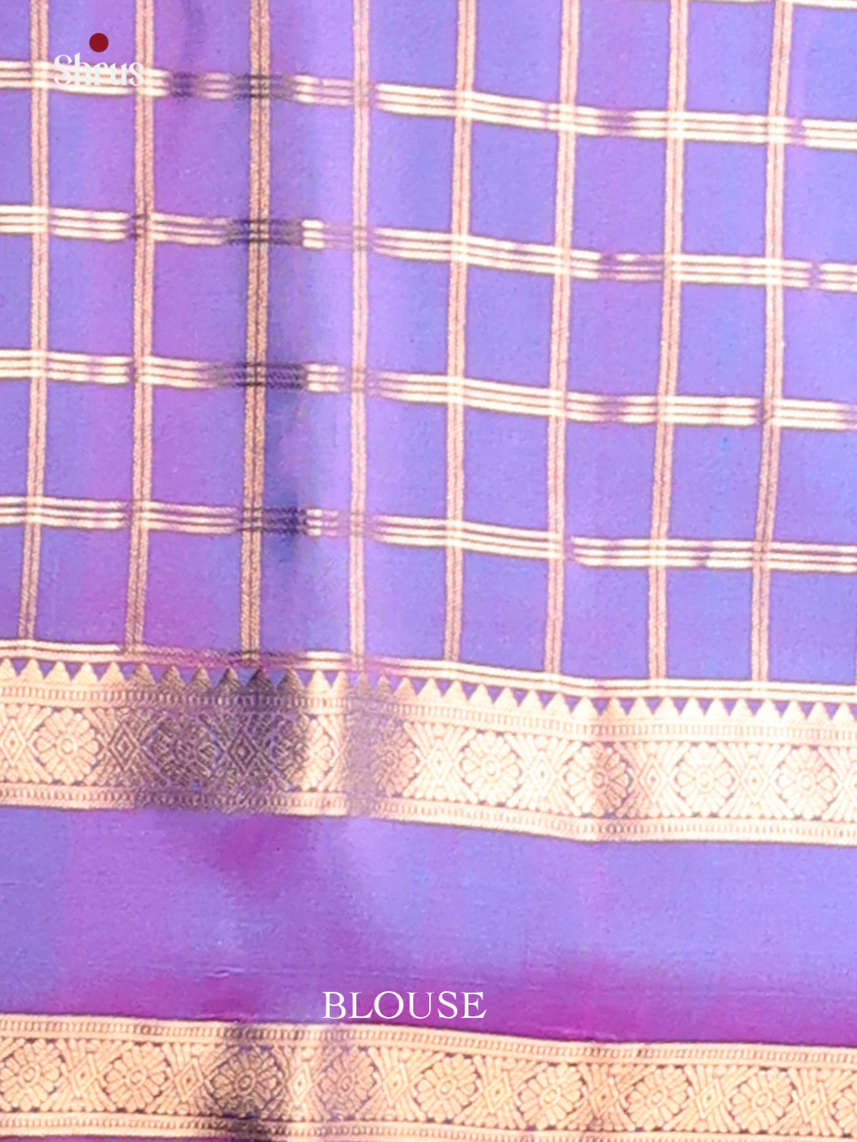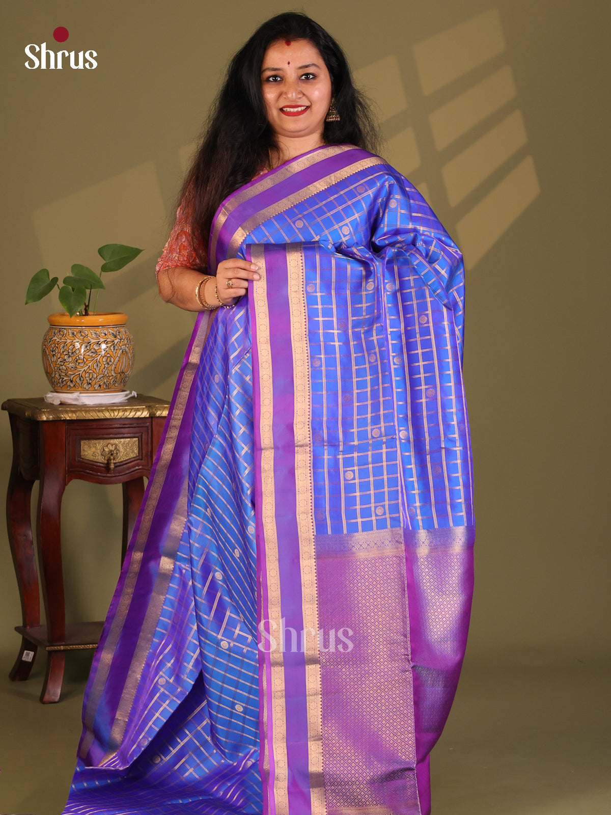 This Rich Blue Soft Silk Saree is a true celebration of craftsmanship and grace. Woven from pure silk, it features delicate zari checks and buttas across the body, giving it a refined, timeless appeal. The contrasting Purple rettaipet zari border adds a bold, traditional touch, while the beautifully woven zari brocade pallu brings depth and richness to the drape. A coordinated zari-checked blouse with a zari border completes the ensemble for a polished, elegant finish.