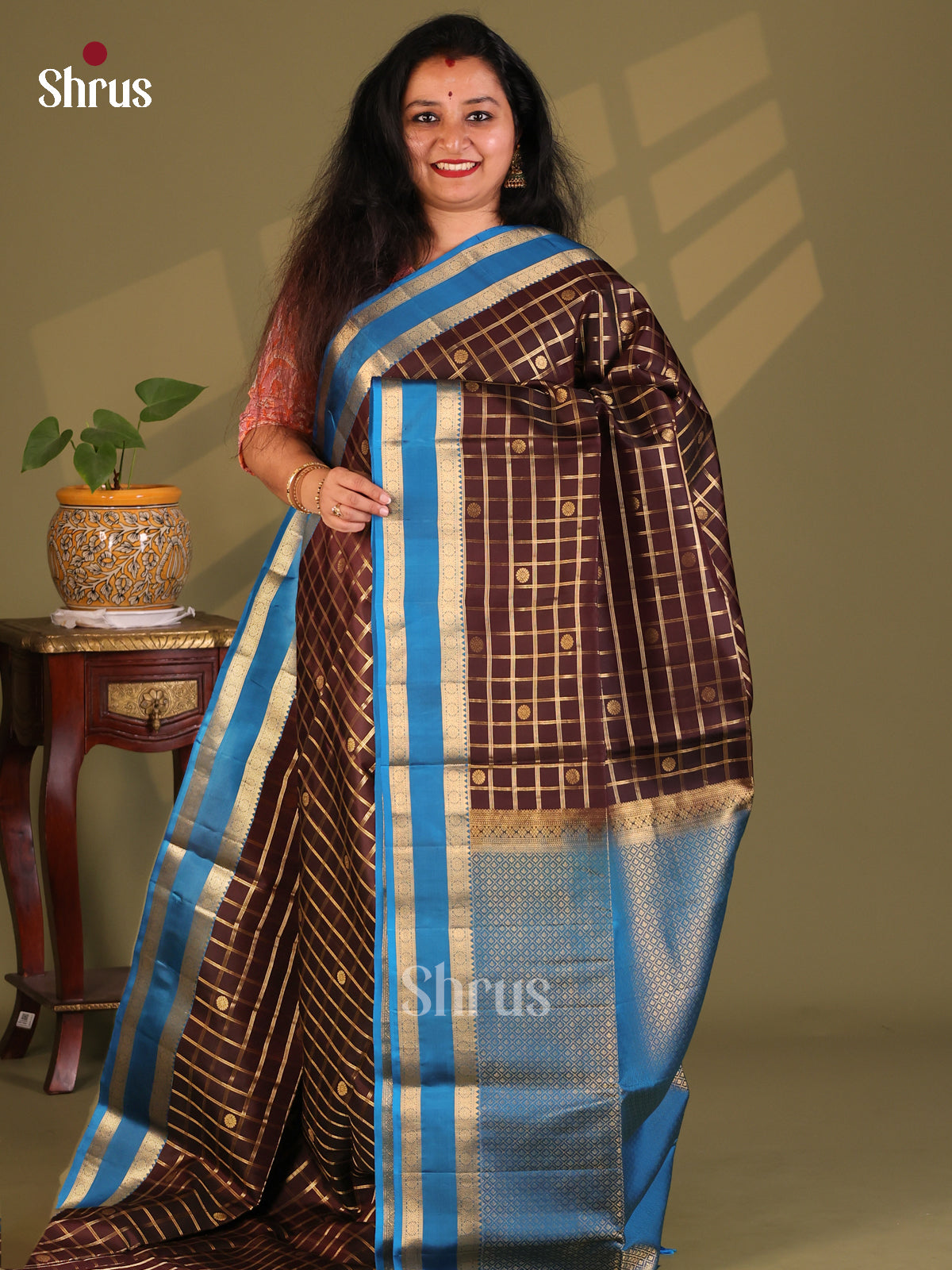 Dazzling Brown & Blue Soft Silk Saree with zari checks, buttas , brocade pallu