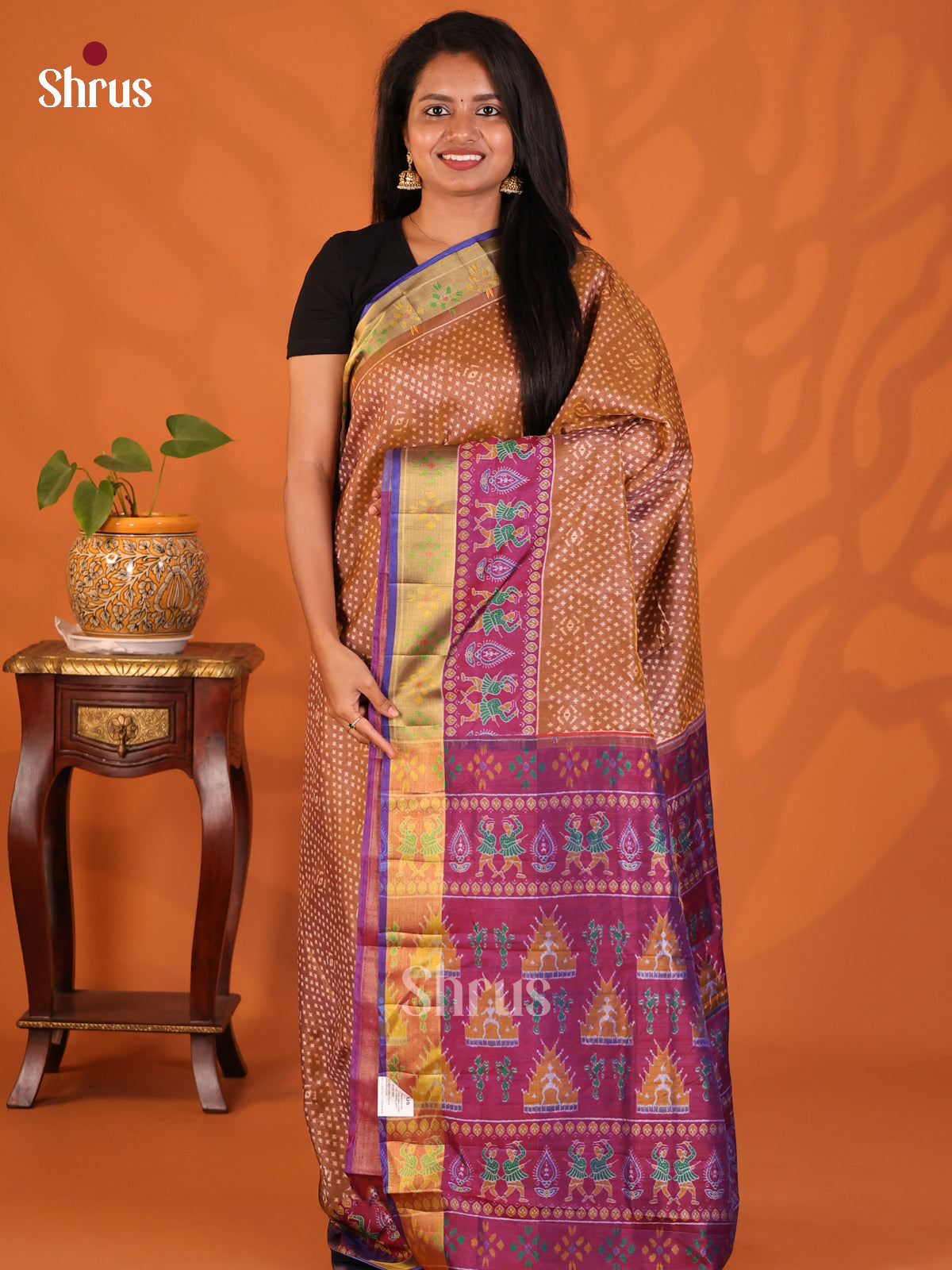 Beautiful Brown Semi Patola Saree features a intricate patola patterns on the full body . Adding to its elegance are the contrast Purple zari woven borders and a patola pattern pallu, all complemented by a printed blouse with zari border.