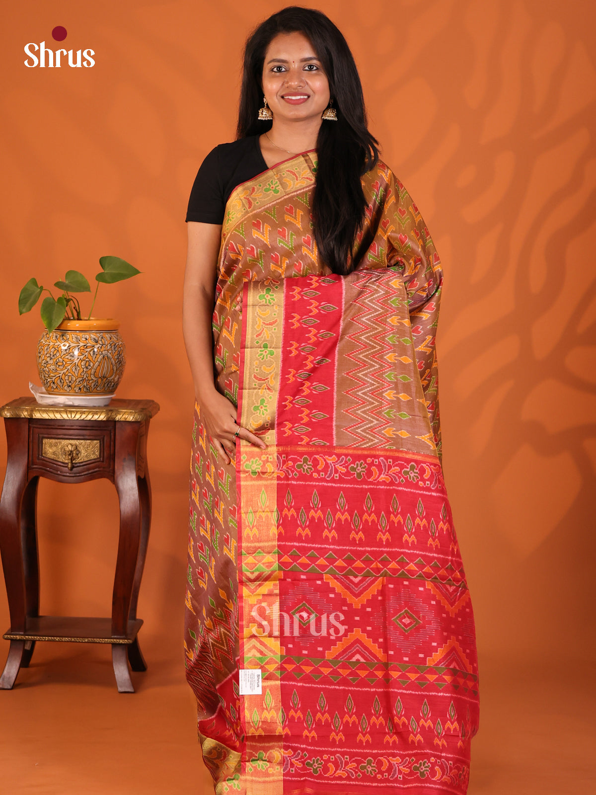 Pretty Brown Semi Patola Saree features a intricate patola patterns on the full body . Adding to its elegance are the contrast Red zari woven borders and a patola pattern pallu, all complemented by a printed blouse with zari border.