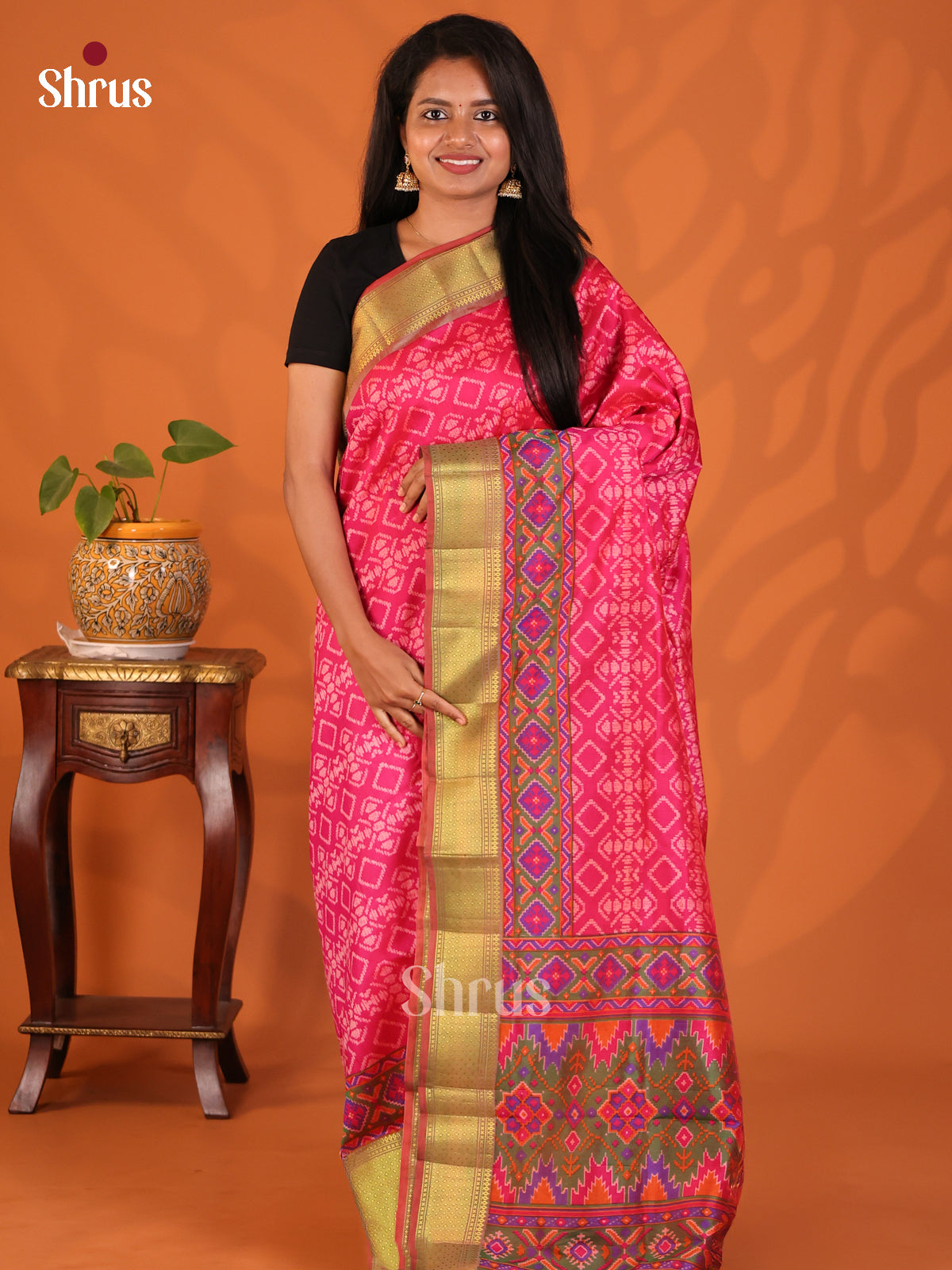Pretty Pink Semi Patola Saree features a intricate patola patterns on the full body . Adding to its elegance are the contrast Green zari woven borders and a patola pattern pallu, all complemented by a printed blouse with zari border.