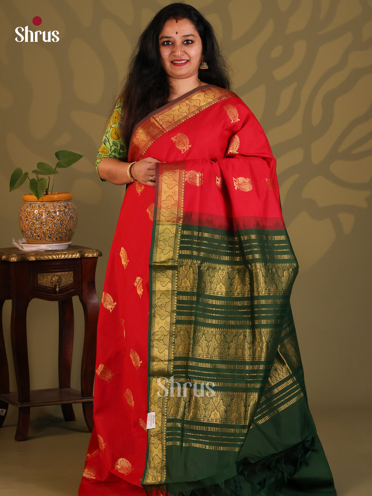 Beautiful Red Silk cotton-halfpure Saree enchants with zari woven buttas on the body with a striking zari border, exuding sophistication. The vibrant Green zari woven pallu provides a striking contrast, while the contrast blouse with zari border complements the overall aesthetic