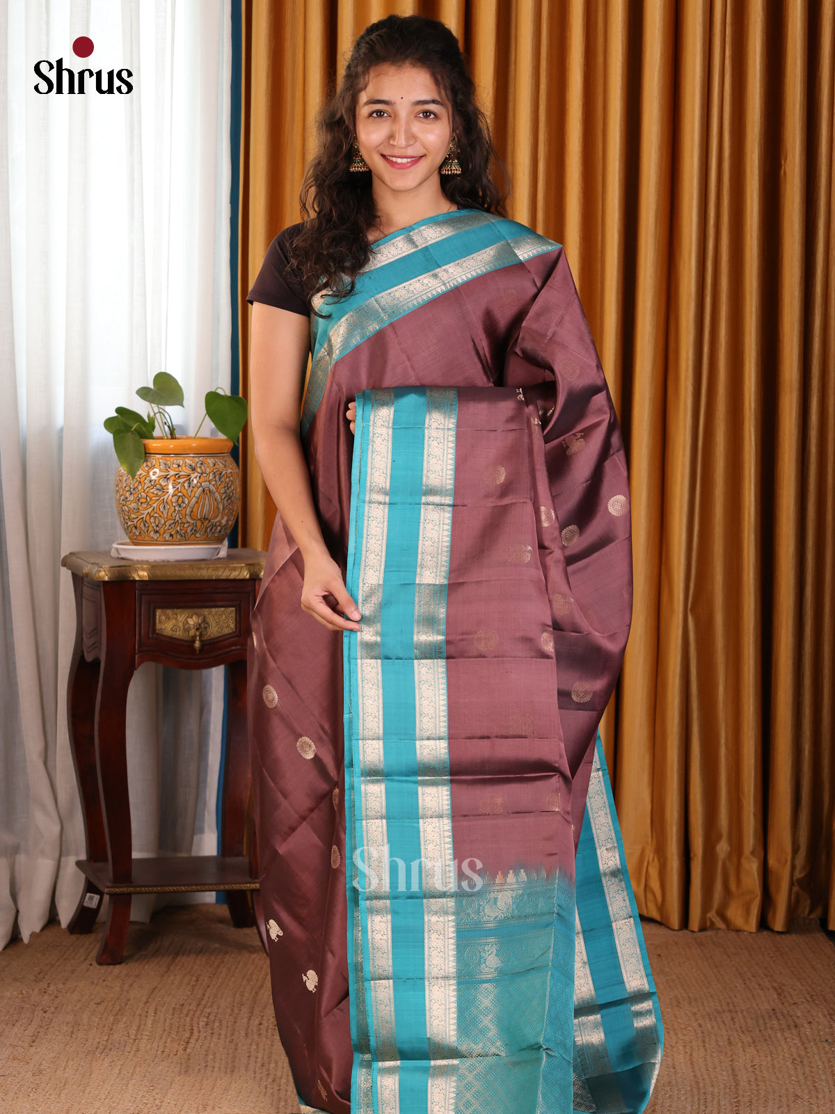 Exquisite Brown Soft silk Saree with peacock, chakra buttas & Teal rettaipet Border