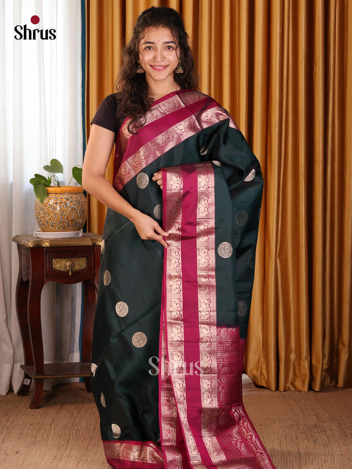 Pretty Dark Green Soft silk Saree with gold chakra motifs & maroon rettaipet border