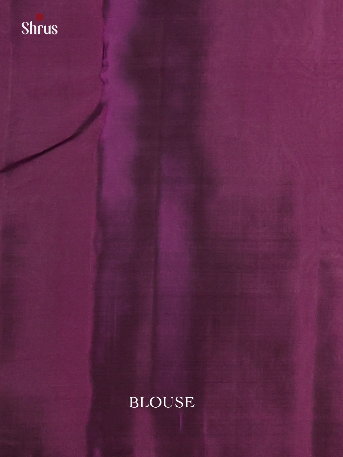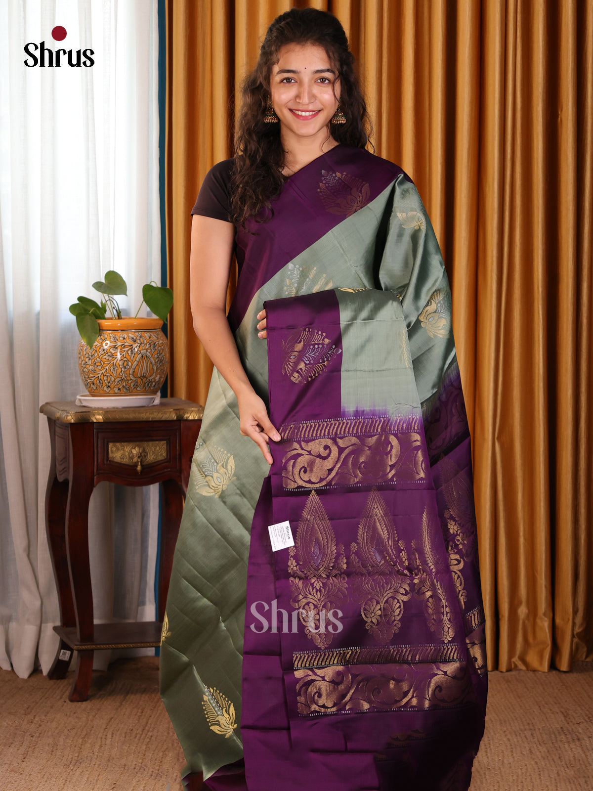 Pretty Pastel Green(Half Pure) Silk Saree enchants with gold ,silver zari woven floral motifs on the body & bounded with contrast Violet border gives a classy look .The Splendid contrast pallu with zari woven brocade & plain blouse lends compliments