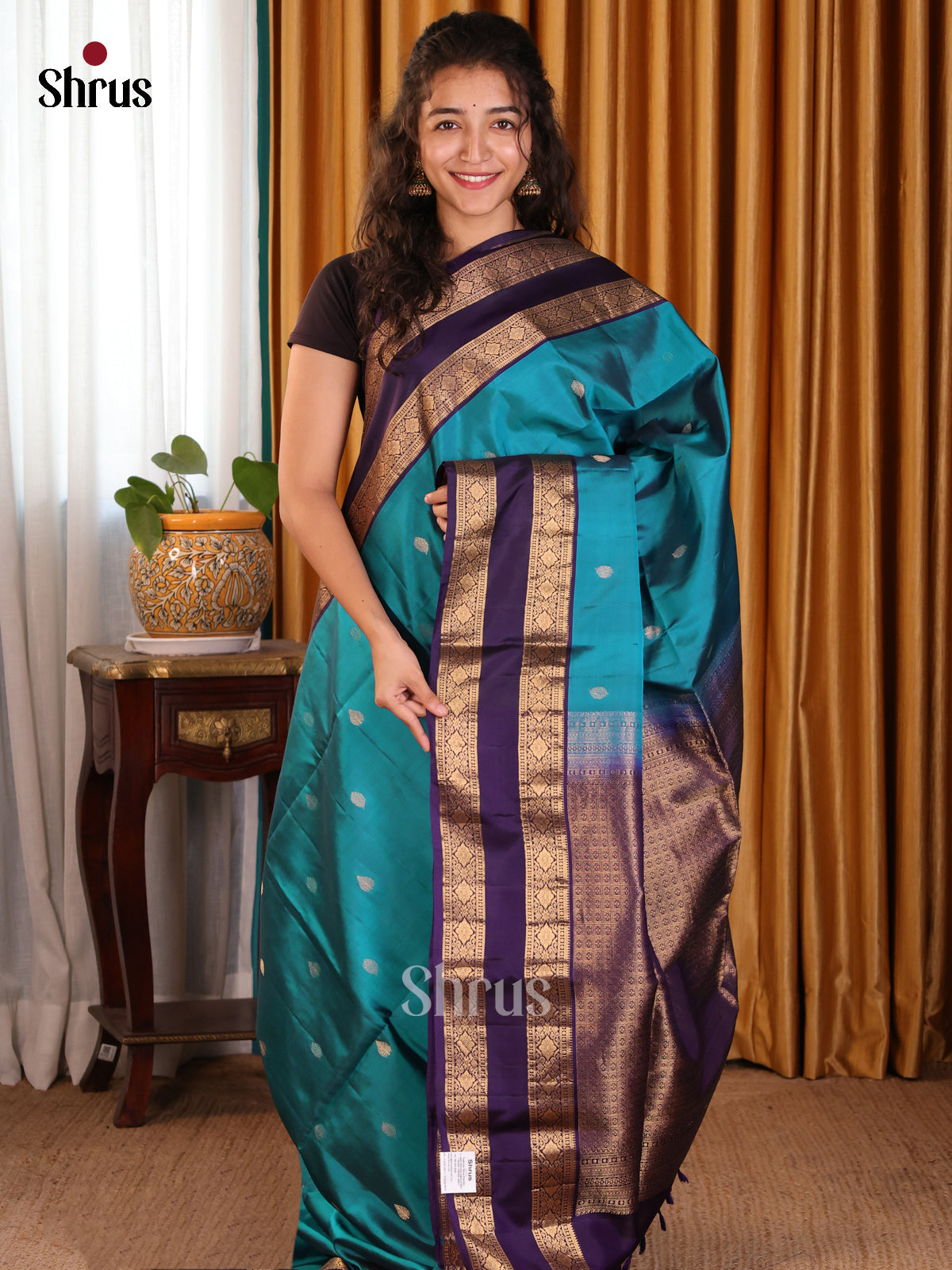 Step into elegance with this vibrant Blue soft silk saree, shimmering with dainty gold zari buttas that lend a luminous charm to its body. The striking contrast Violet rettaipet borders on both sides, adorned with intricate zari weaving, offer a regal definition to the saree’s silhouette. A luxuriously rich Violet pallu flows gracefully, matched perfectly with a plain Violet blouse that balances tradition with sophistication. Crafted for those who admire classic weaves and modern finesse, this piece is a celebration of heritage and grace. Explore the finest kanchipuram soft silk sarees and embrace a handcrafted marvel perfect for festive and ceremonial moments.