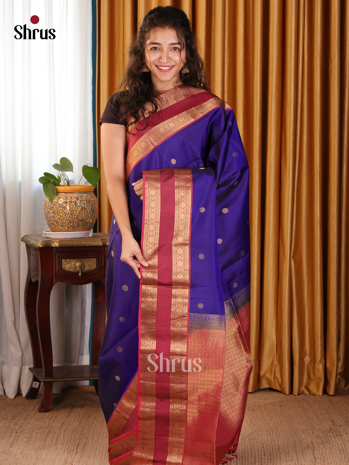 Immerse yourself in the captivating charm of this serene blue soft silk saree, a testament to exquisite craftsmanship. The saree's graceful body is enchanted with delicate zari-woven floral buttas, adding a subtle yet shimmering allure. It is beautifully contrasted by a splendid maroon Rettaipet zari border, showcasing intricate designs that lend a regal touch. The very rich contrast zari brocade pallu adds a grand finish, completing this elegant ensemble. Paired with a plain blouse, this saree enhances your overall sophisticated look. Discover timeless elegance when you Buy Soft Silk Sarees Latest Collection Online, perfect for any special occasion.
