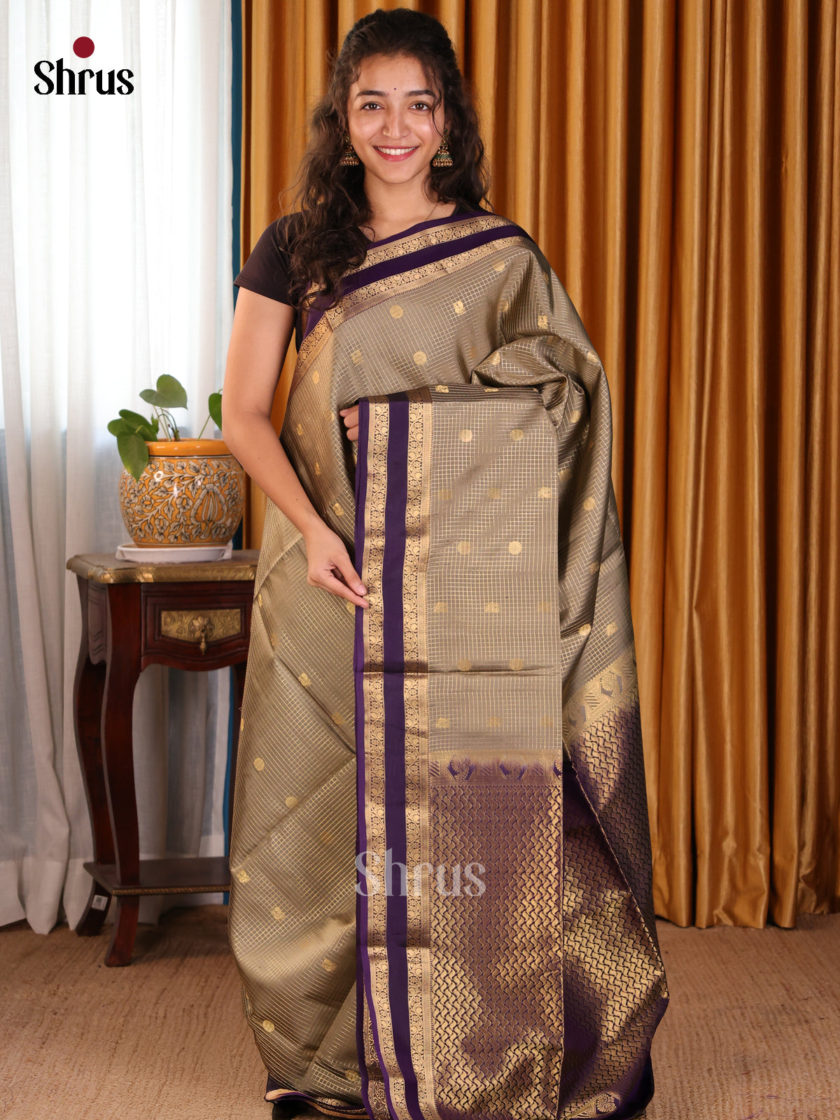 Elegant Grey with violet Softsilk Saree gold zari vaira oosi check , buttas , rettaipet border