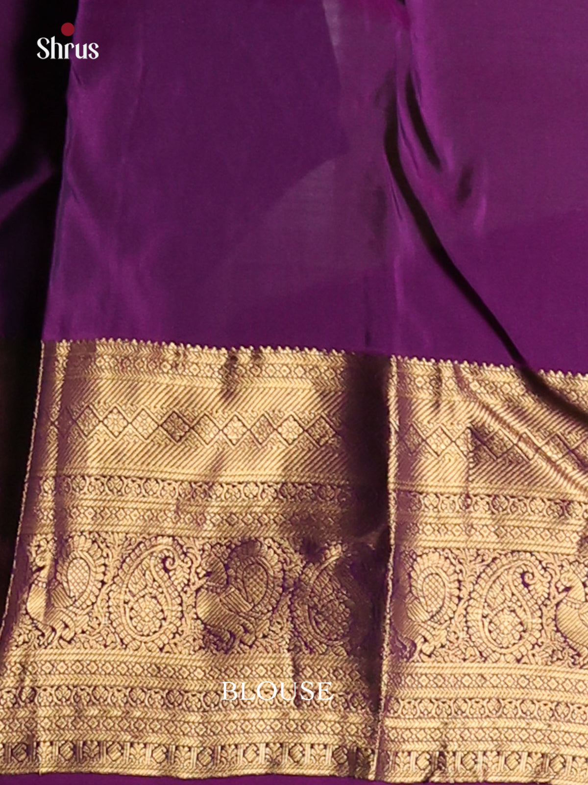Elegant Blue Kanchipuram Half-Pure Saree features zari-woven thousand buttas across the body, beautifully accented by contrasting Violet zari borders for a timeless appeal. The rich contrast zari brocade pallu and plain blouse with matching border complete the look with refined elegance.
