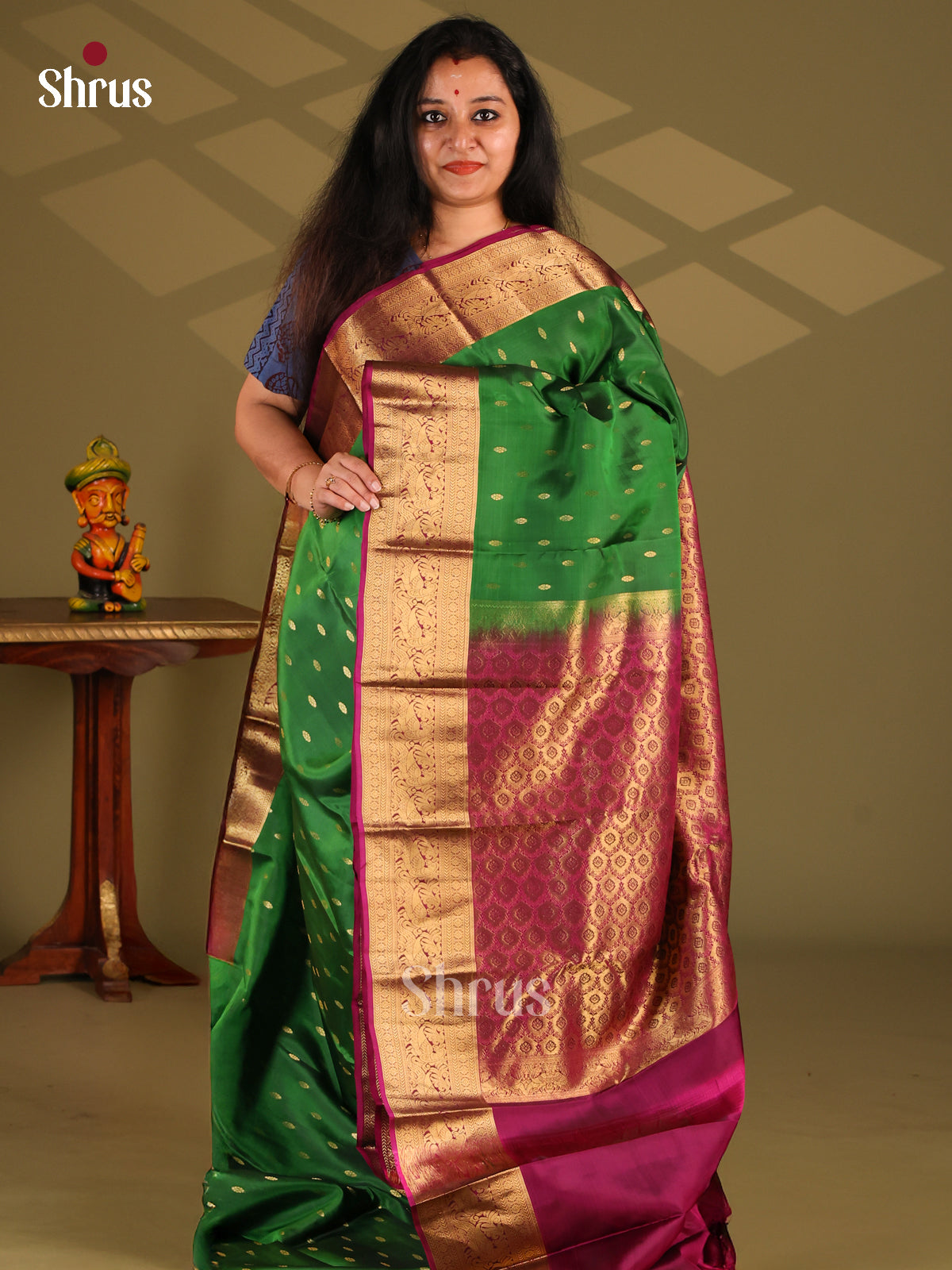 Beautiful Green Kanchipuram Half-Pure Saree features zari-woven floral buttas across the body, beautifully accented by contrasting Maroon zari borders for a timeless appeal. The rich contrast zari brocade pallu and plain blouse with matching border complete the look with refined elegance.