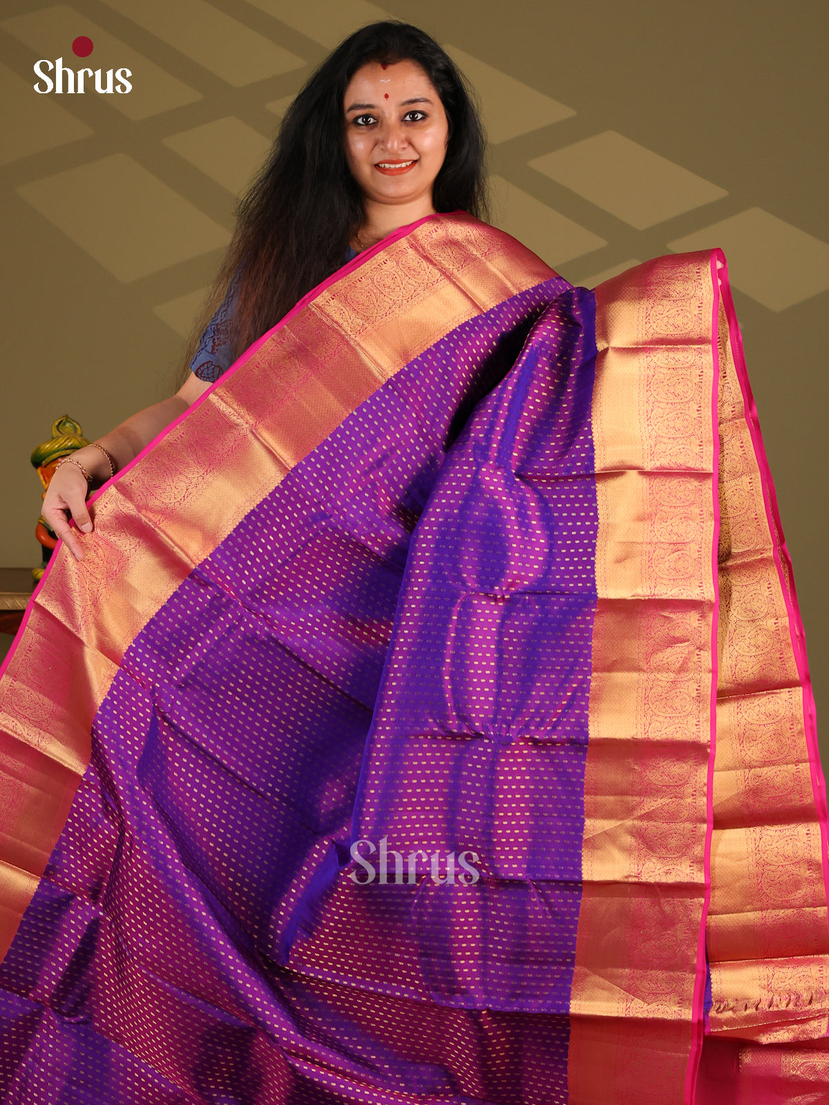 Beautifully Chic Purple Kanchipuram Half-Pure Saree features zari-woven floral buttas across the body, beautifully accented by contrasting Pink zari borders for a timeless appeal. The rich contrast zari brocade pallu and plain blouse with matching border complete the look with refined elegance.