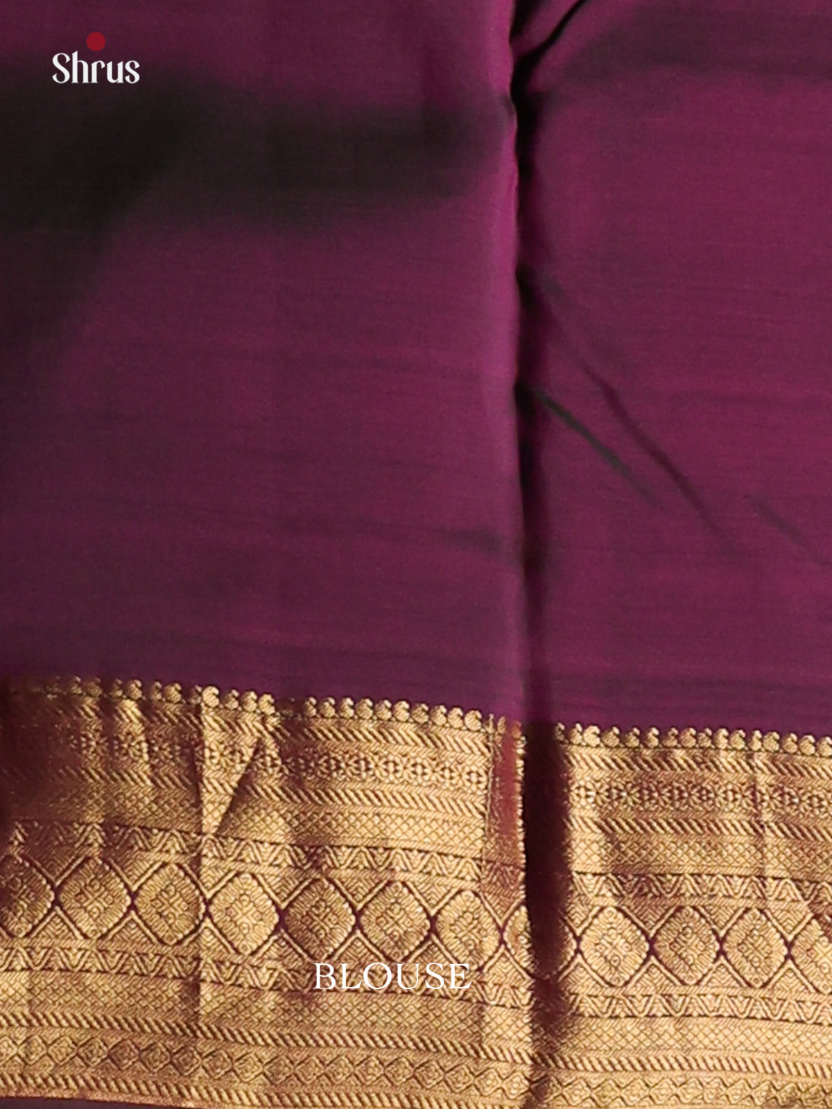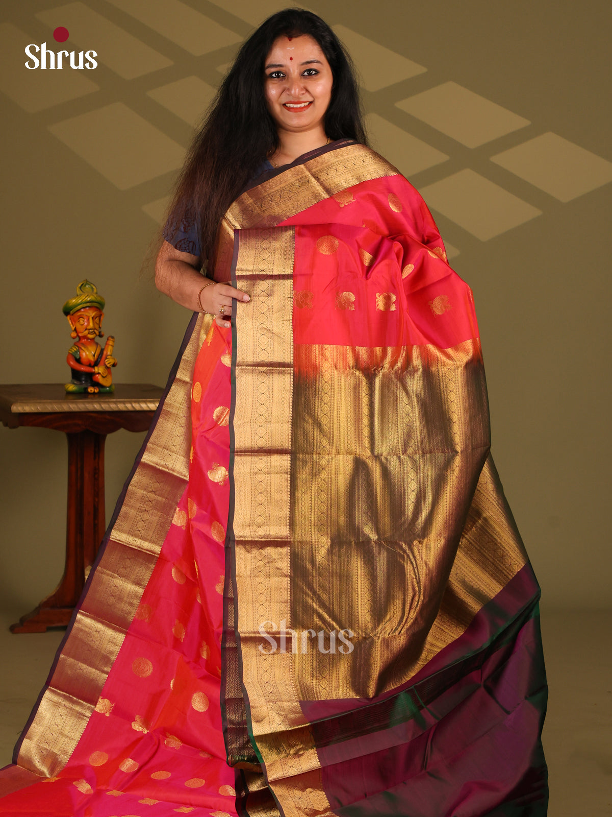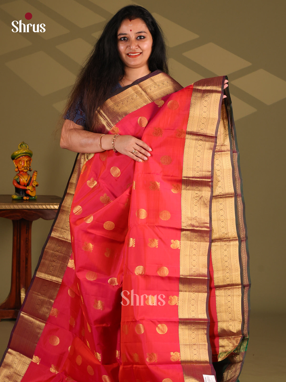 Exquisite Red Kanchipuram Half-Pure Saree enchants with zari floral , peacock buttas across the body, enhanced by Purple zari borders for a timeless appeal. The rich Purple zari brocade pallu and contrasting plain blouse complete the look with refined elegance.