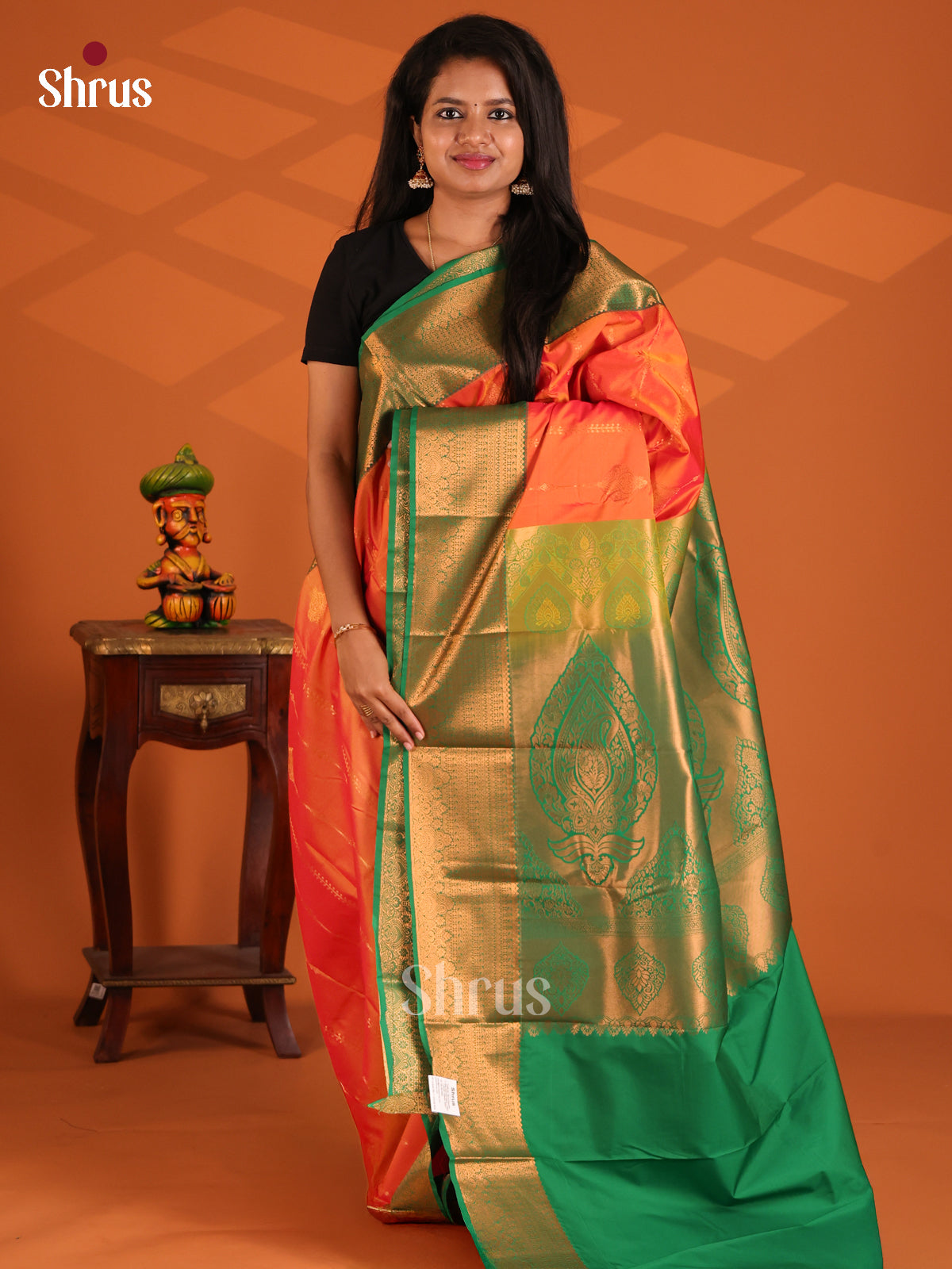 Radiant Orange Semi Kanchipuram Silk Saree enchants with Zari woven stripes, buttas on the body . The contrast Green Zari woven border & Pallu with brocade lends a gorgeous complement. The plain Green blouse with zari border completes this ensemble