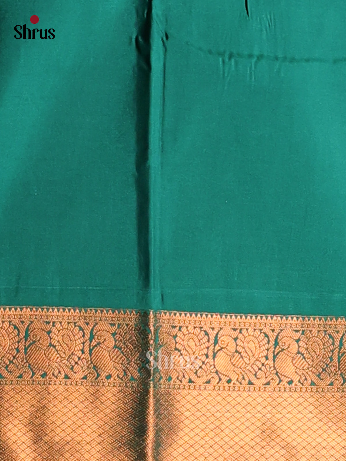 Charming Pink Semi Kanchipuram Silk Saree enchants with Zari woven block buttas on the body . The contrast Green Zari woven border & Pallu with brocade lends a gorgeous complement. The plain contrast blouse with zari border completes this ensemble