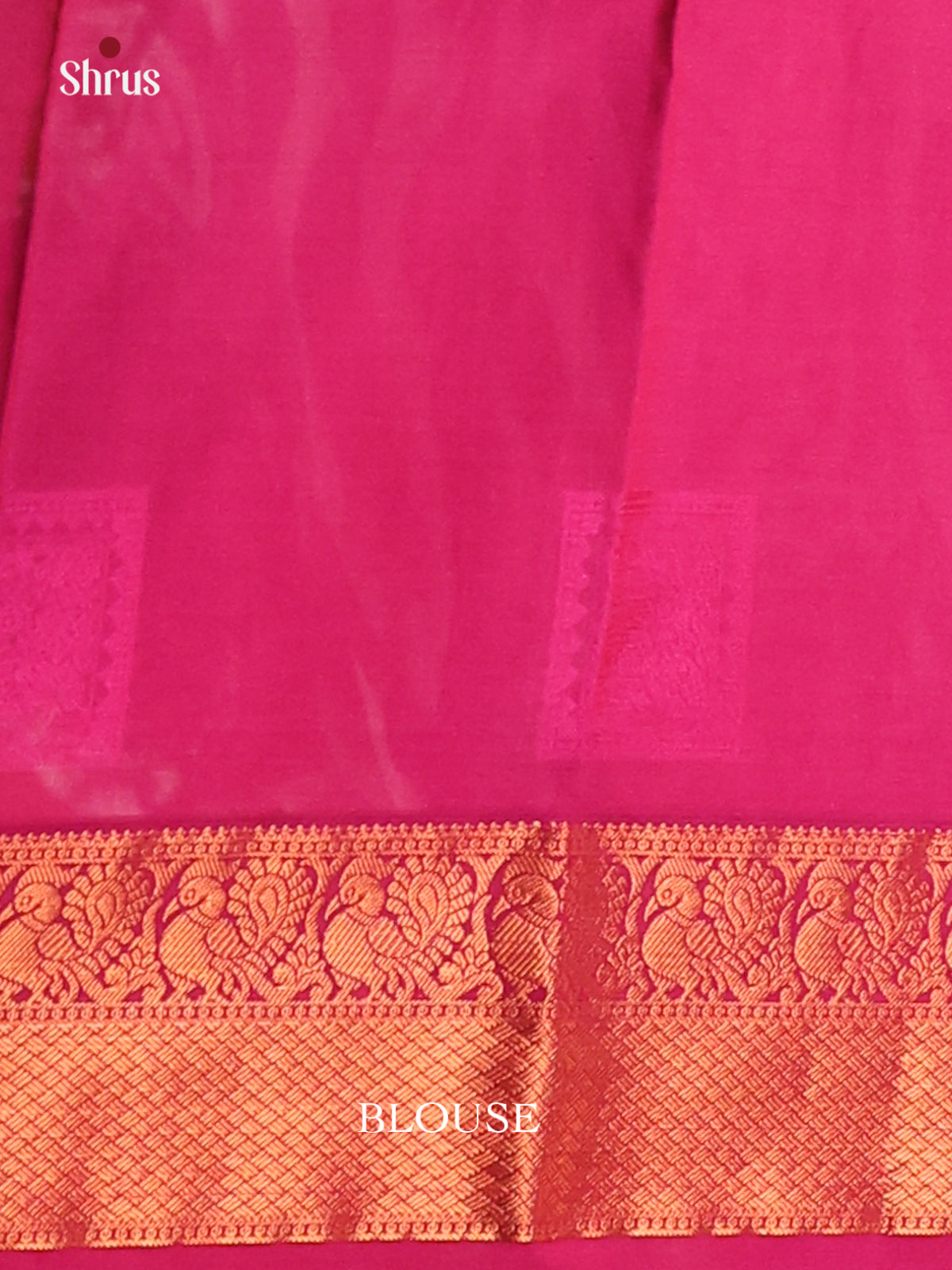 Beautiful Green Semi Kanchipuram Silk Saree enchants with Zari woven block buttas on the body . The contrast Pink Zari woven border & Pallu with brocade lends a gorgeous complement. The plain contrast blouse with zari border completes this ensemble