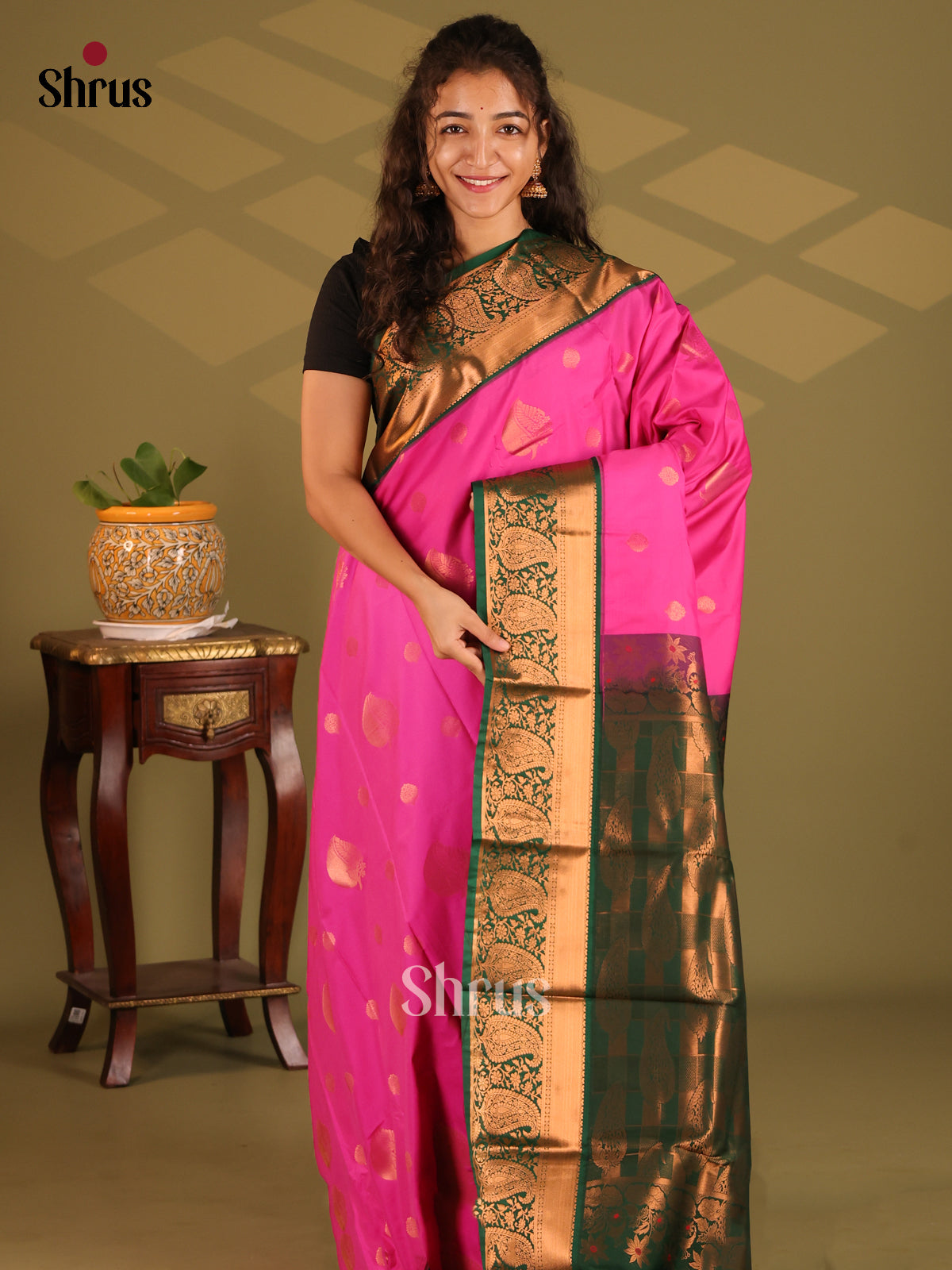 Pretty Pink Semi Kanchipuram Silk Saree enchants with Zari woven buttas on the body . The contrast Green Zari woven border & Pallu with brocade lends a gorgeous complement. The plain Green blouse with zari border completes this ensemble