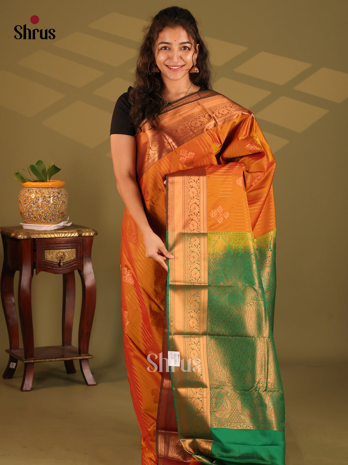 Rust with Green - Semi Kanchipuram Saree
