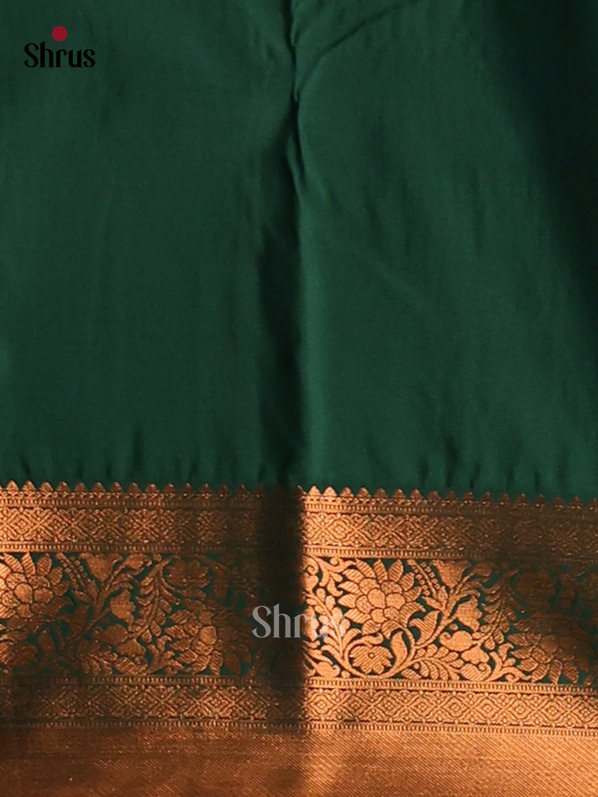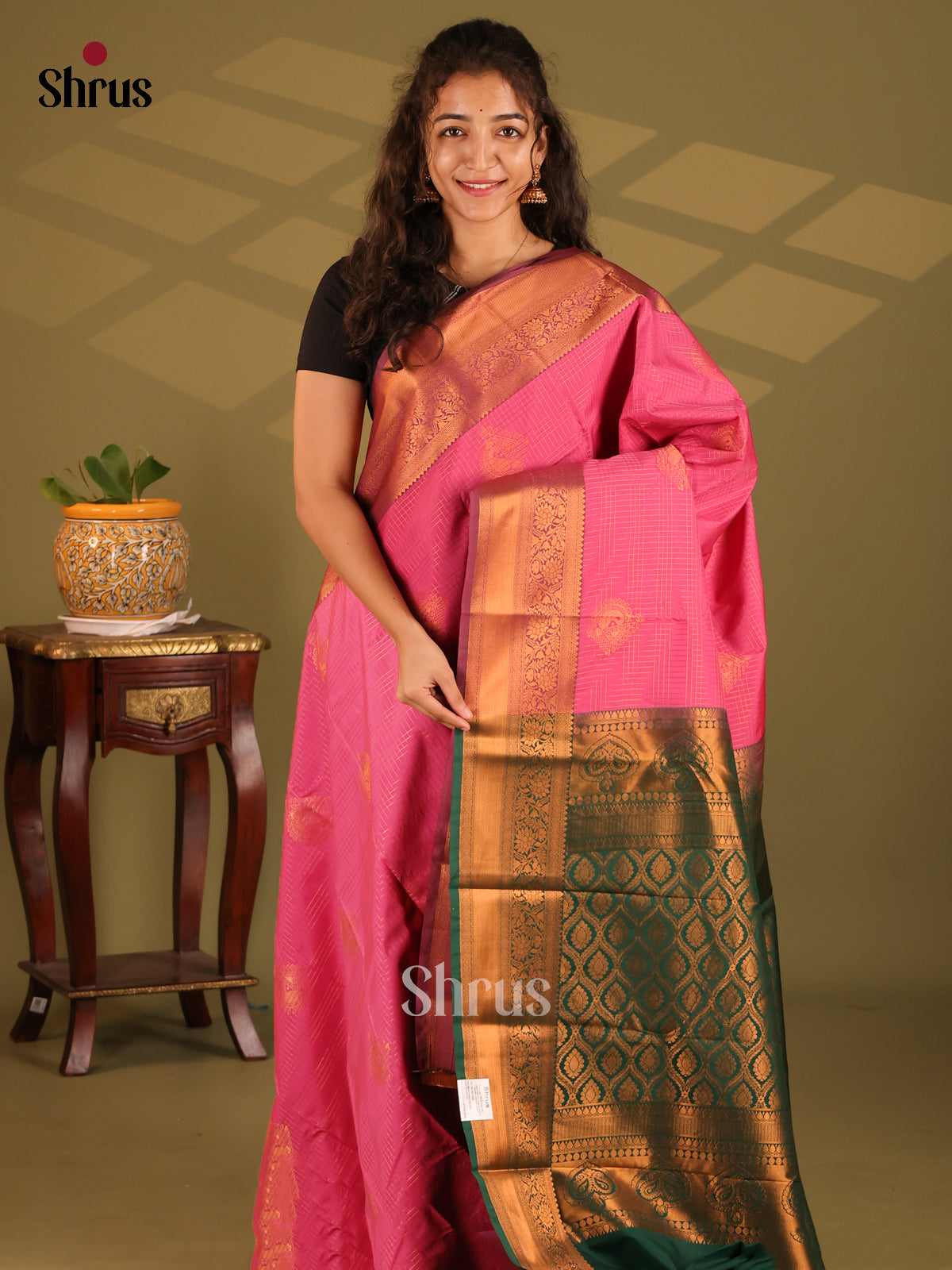 Charming Pink Semi Kanchipuram silk saree, adorned with zari checks , buttas across the body, exudes timeless charm. It is beautifully complemented by a rich zari border and a Green brocade-woven zari pallu. A plain contrast blouse completes this stunning ensemble.