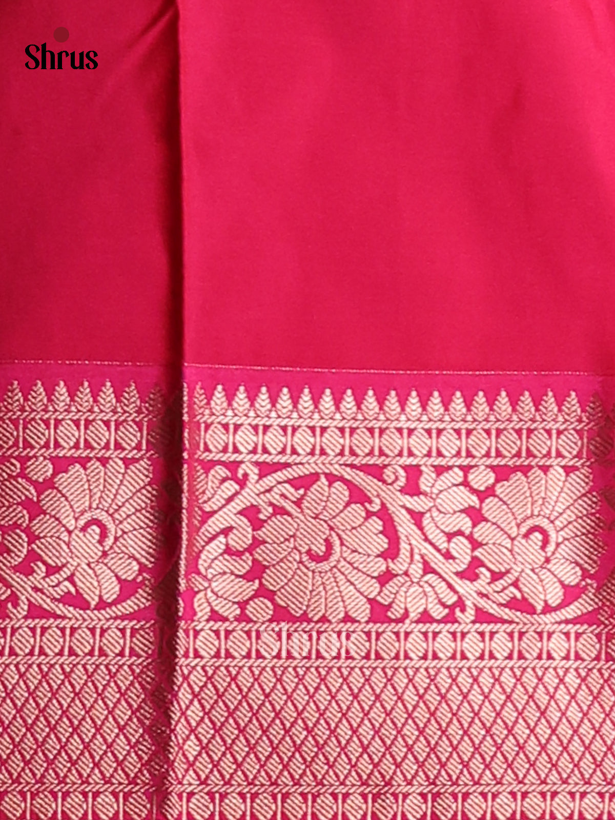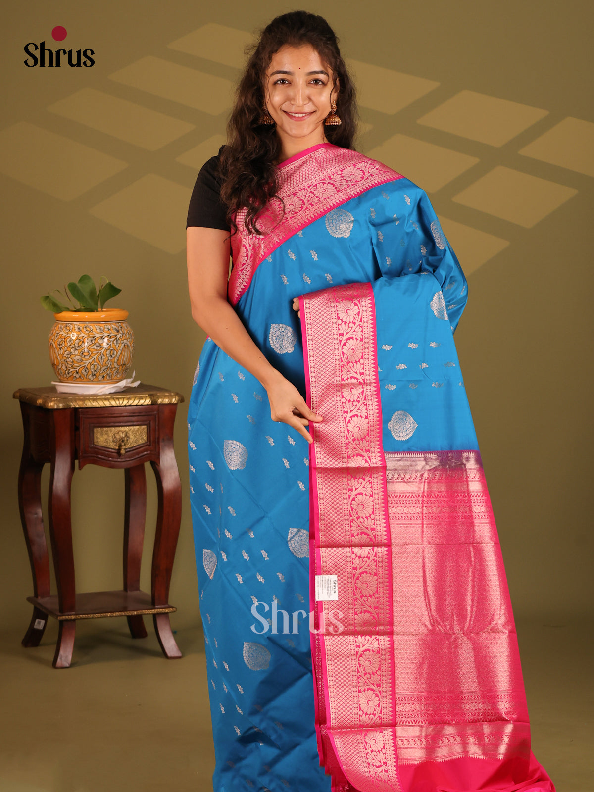 Very Pretty Blue Semi Kanchipuram silk saree, adorned with zari buttas across the body, exudes timeless charm. It is beautifully complemented by a rich contrast Pink zari border and a brocade-woven zari pallu. A plain contrast blouse completes this stunning ensemble.