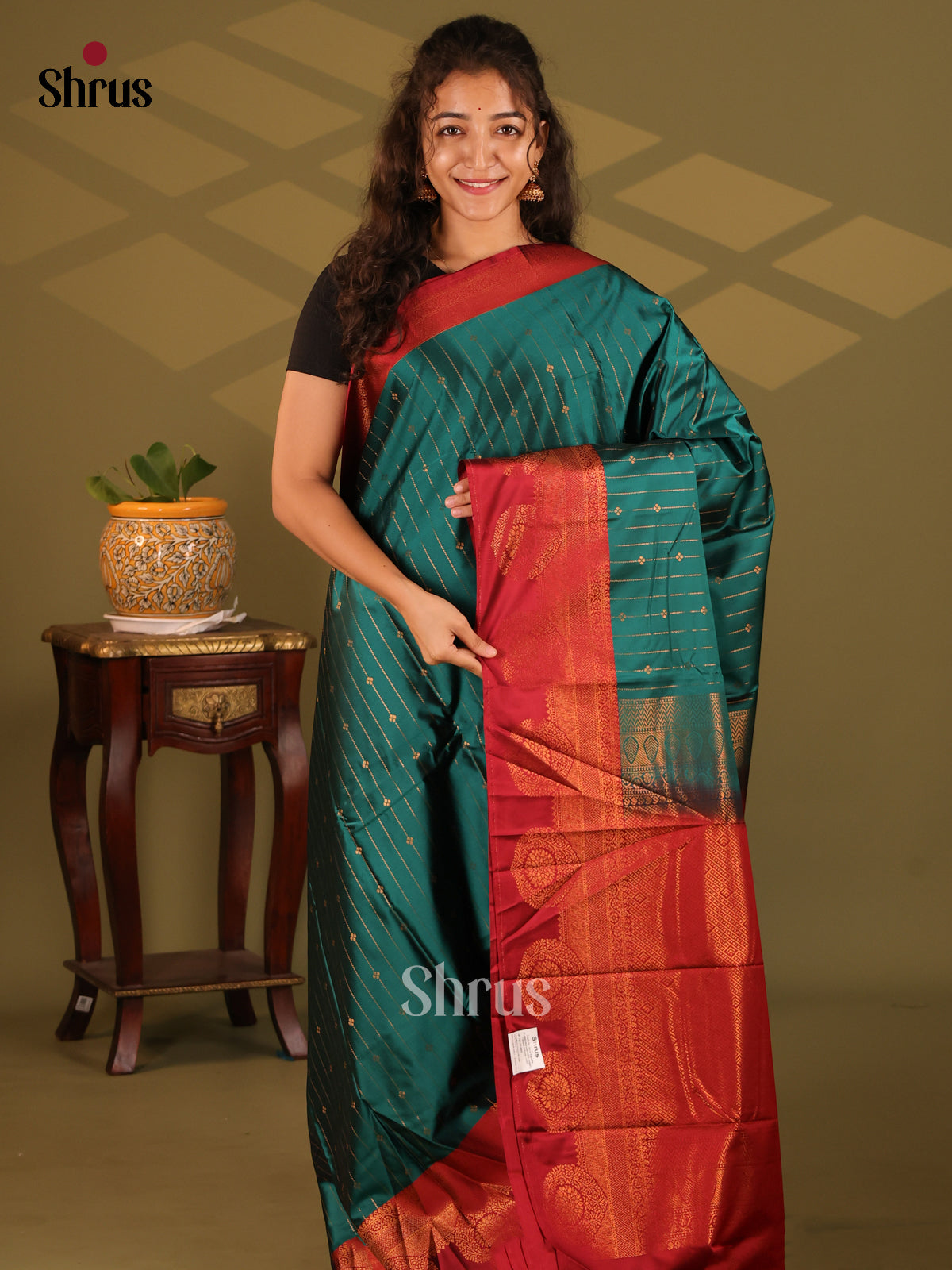 Elegant Peacock Blue Semi Kanchipuram Silk Saree enchants with Zari stripes, buttas on the body .The rich contrast Maroon zari border & zari Pallu with brocade lends a gorgeous complement. The plain contrast blouse with zari border completes this ensemble