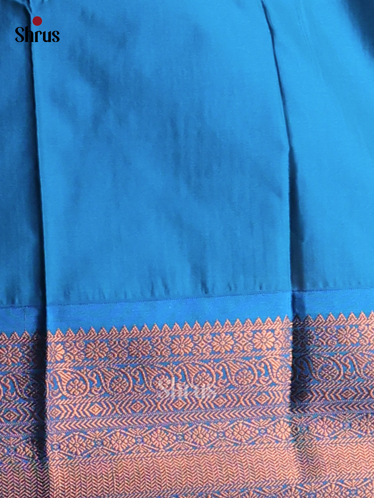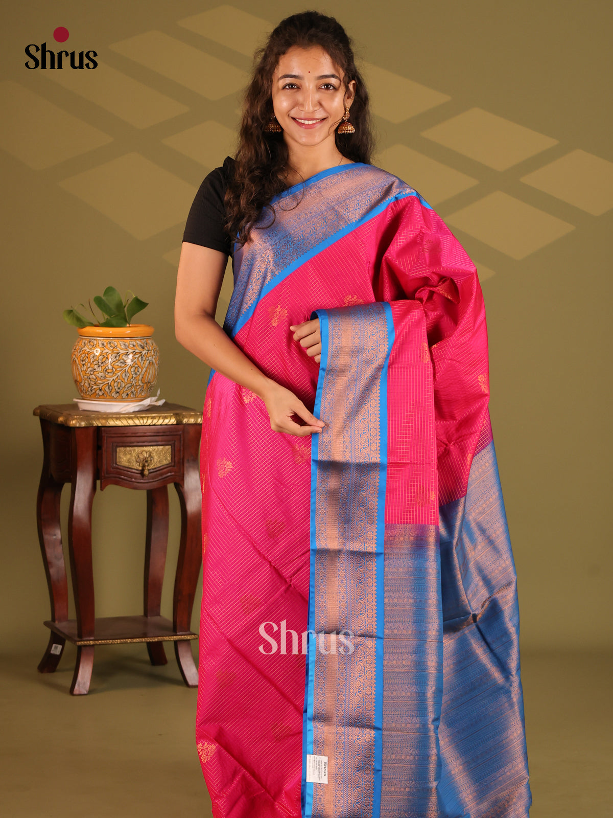 Charming Pink Semi Kanchipuram Silk Saree enchants with Zari checks, buttas on the body .The rich contrast Blue zari border & zari Pallu with brocade lends a gorgeous complement. The plain contrast blouse with zari border completes this ensemble