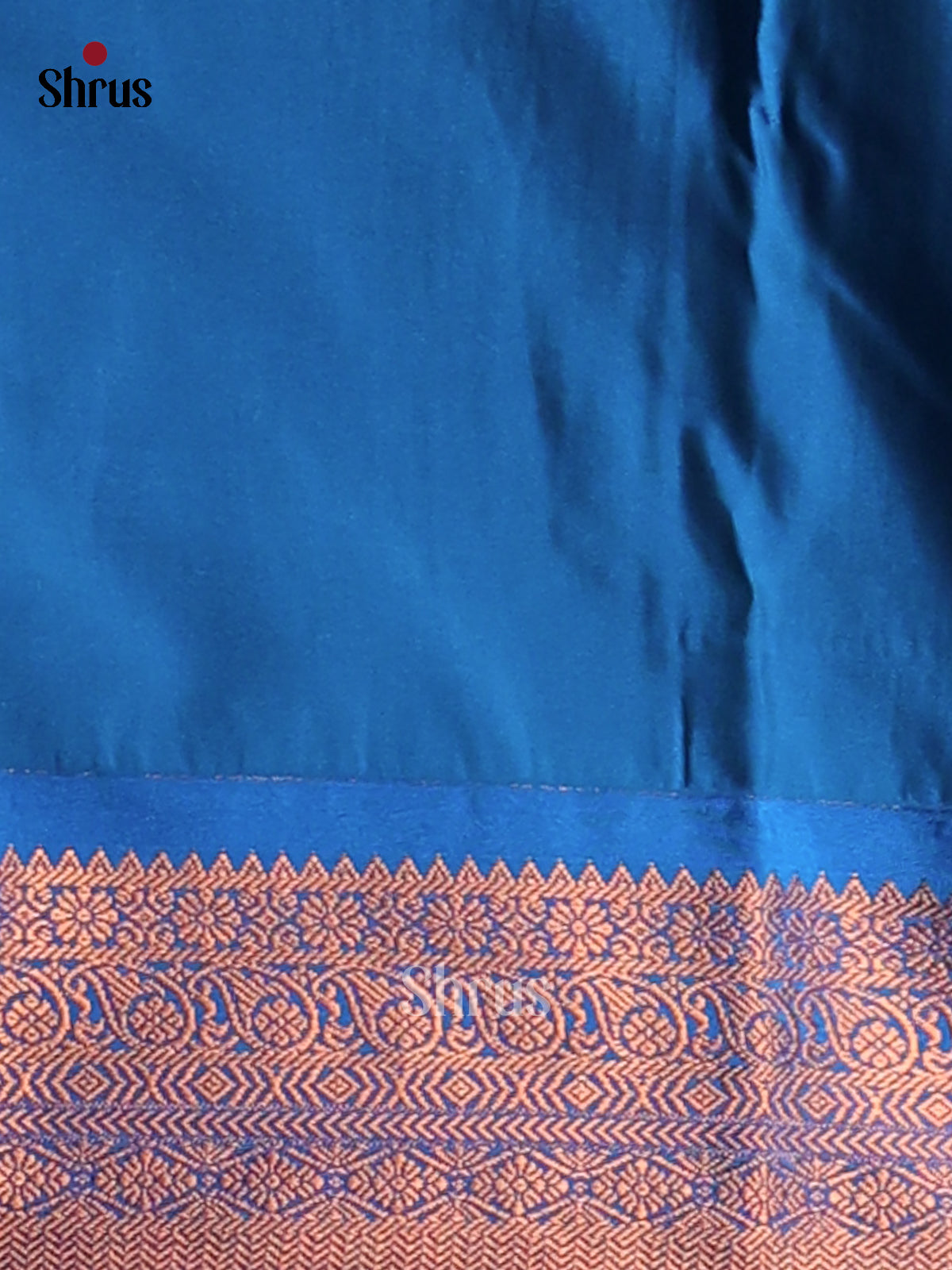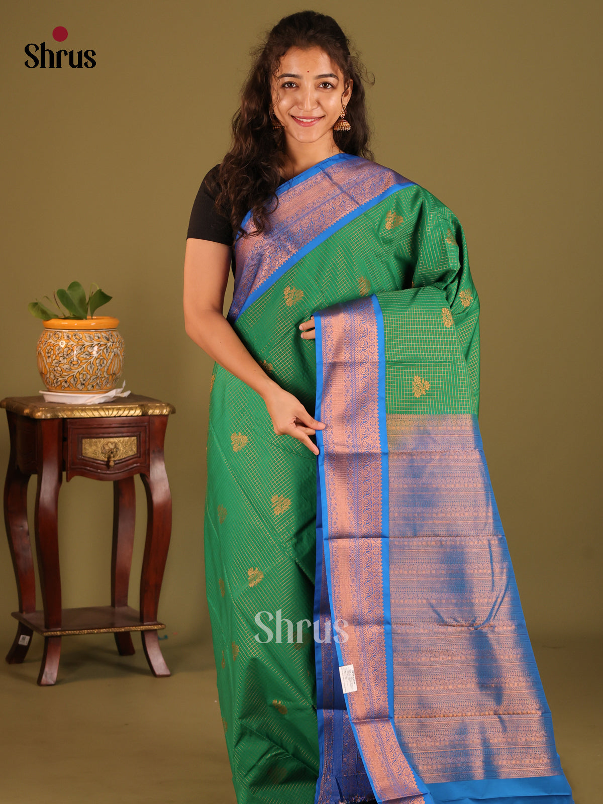 Elegant Green Semi Kanchipuram Silk Saree enchants with Zari checks, buttas on the body .The rich contrast Blue zari border & zari Pallu with brocade lends a gorgeous complement. The plain contrast blouse with zari border completes this ensemble