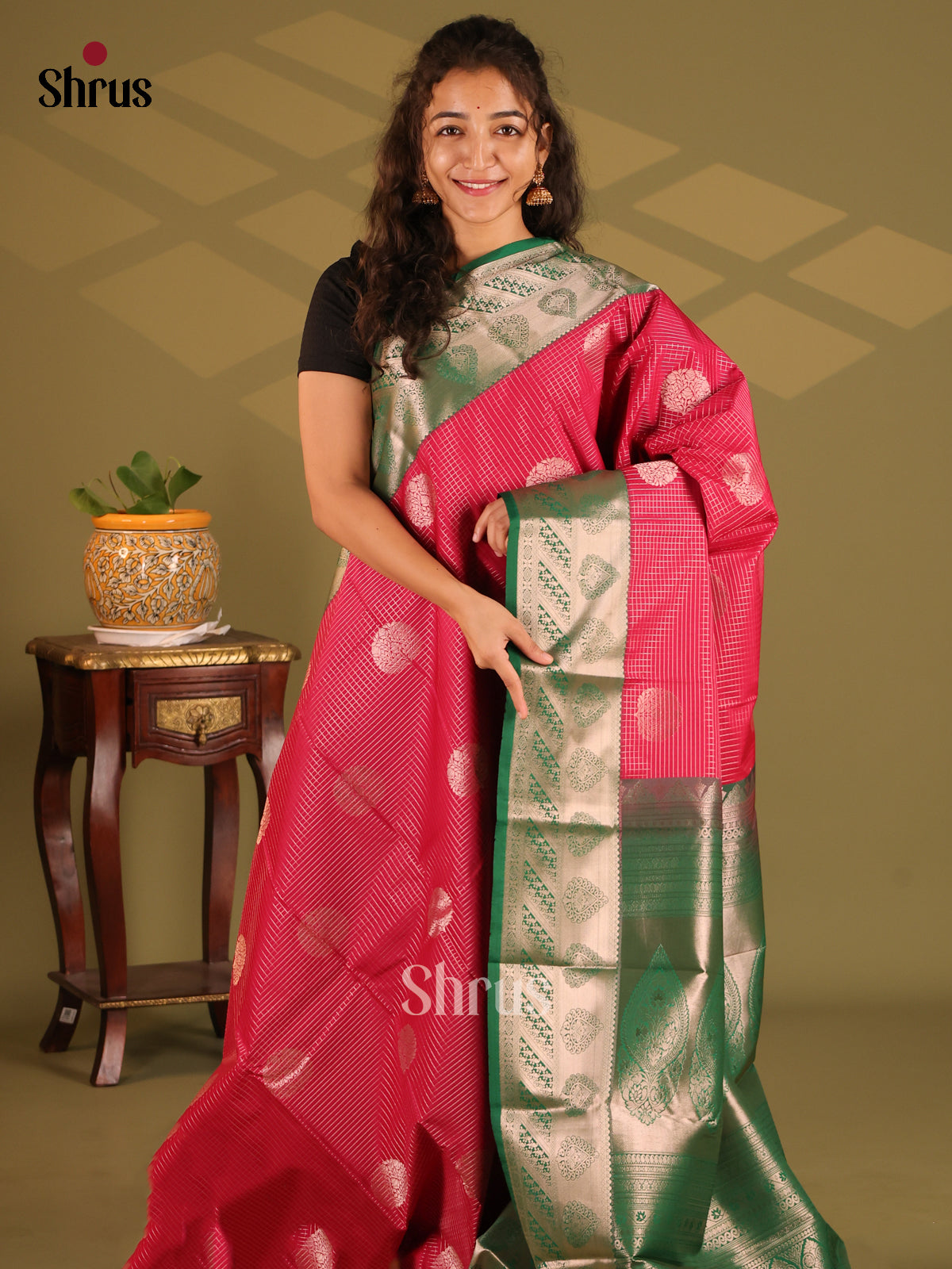 Classy Maroon Semi Kanchipuram silk saree, adorned with zari checks , buttas across the body, exudes timeless charm. It is beautifully complemented by a rich contrast Green zari border and a brocade-woven zari pallu. A plain contrast blouse completes this stunning ensemble.