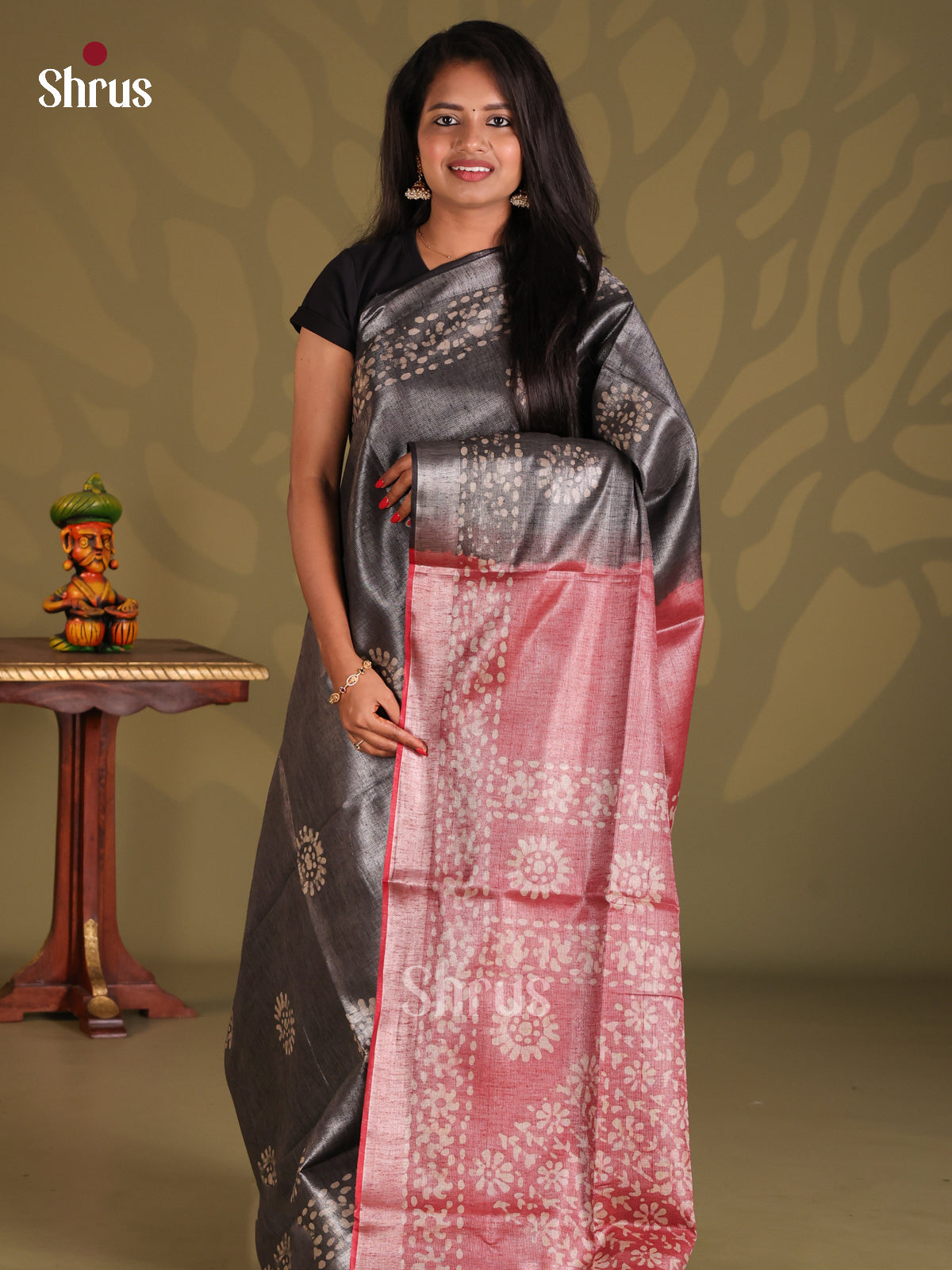Elegant Grey Batik Saree showcases a captivating floral batik print across the body, gracefully paired with a vibrant zari border. The striking red pallu adds a bold touch of sophistication, while the matching contrast blouse with a zari border completes the ensemble with timeless charm.