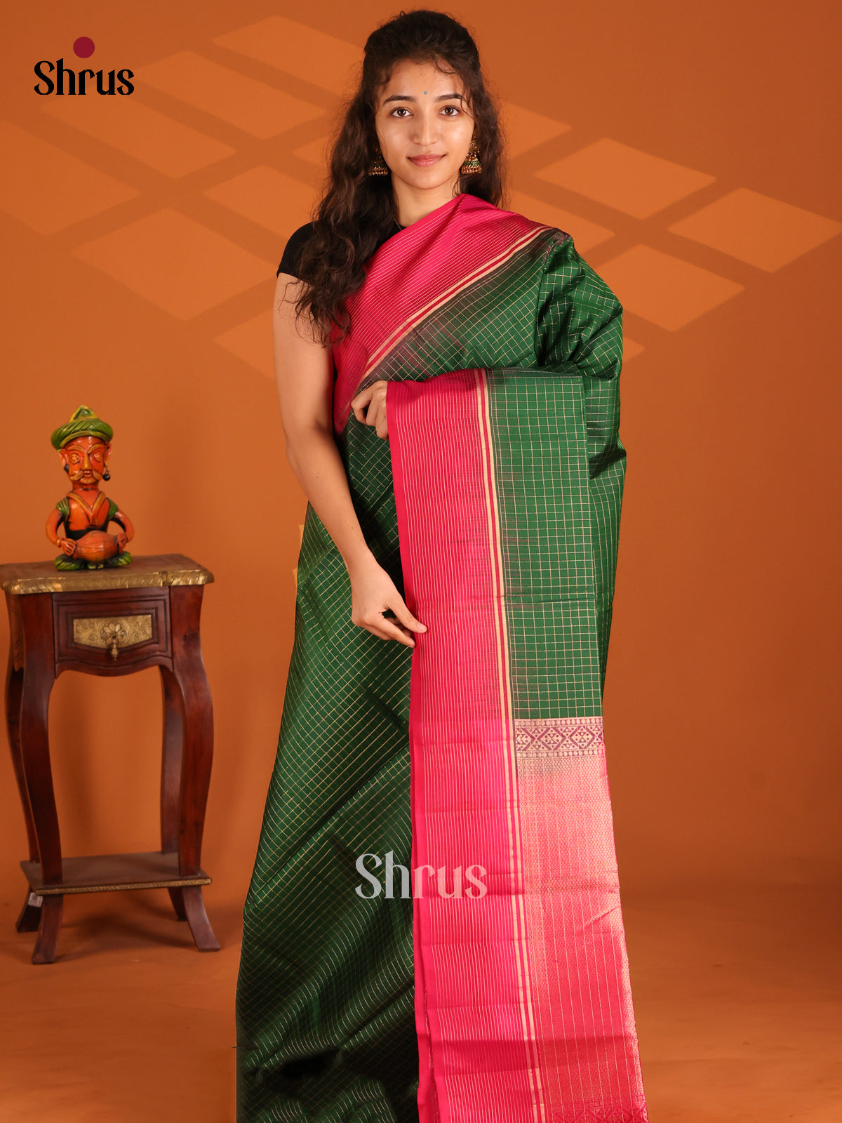 Step into timeless elegance with this Green Soft Silk Saree, designed to captivate with every detail. The body features delicate zari-woven checks, lending a graceful shimmer and texture to the drape. A rich maroon border woven in lustrous zari frames the saree beautifully, while the grand brocade pallu adds opulence and tradition. The contrast blouse complements the ensemble, enhancing its regal charm. Ideal for weddings, festive gatherings, or cultural events, this saree is a seamless blend of heritage and luxury -perfect for the discerning woman who values refined craftsmanship. A classic from the collection of kanchipuram soft silk sarees.