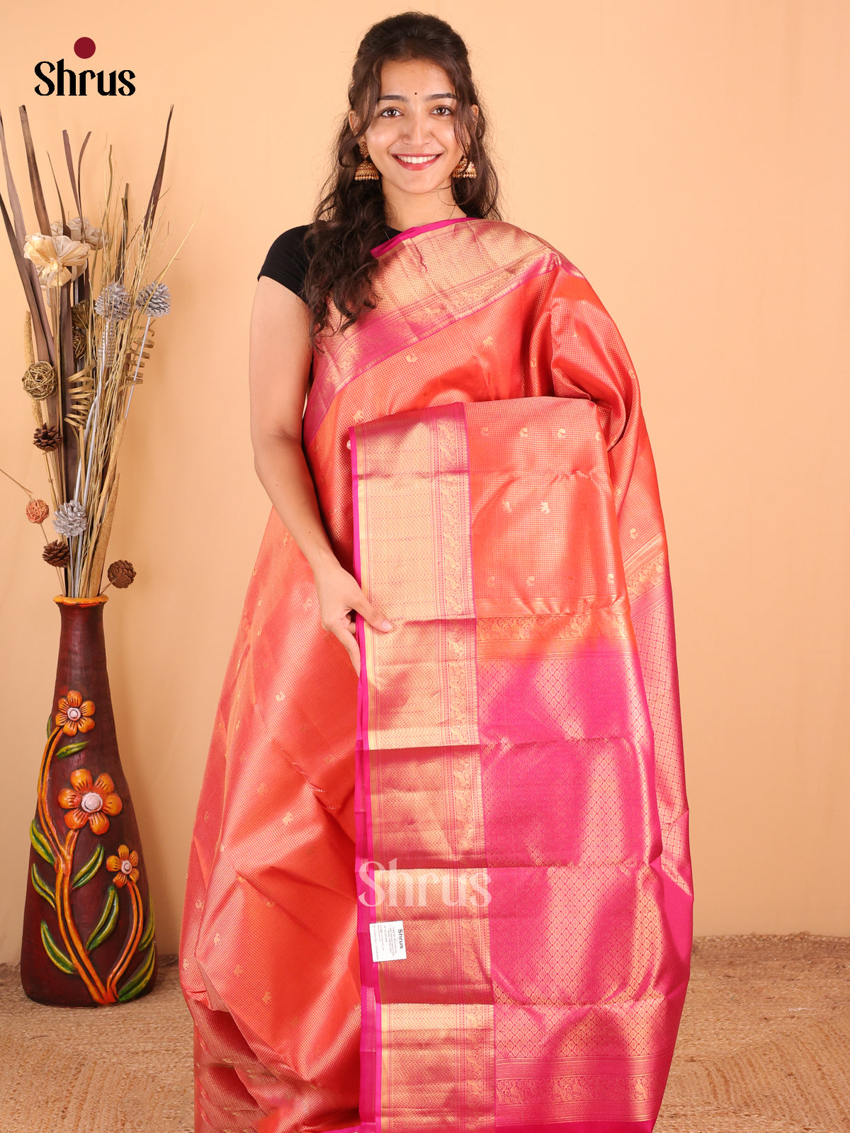 Drape yourself in the radiant allure of this Orange Kanjivaram silk saree. The vibrant orange body features delicate woven checks and small shimmering zari buttas, adding a touch of subtle elegance. The striking contrast pink border is intricately adorned with lustrous golden zari, featuring delicate floral vine patterns.
