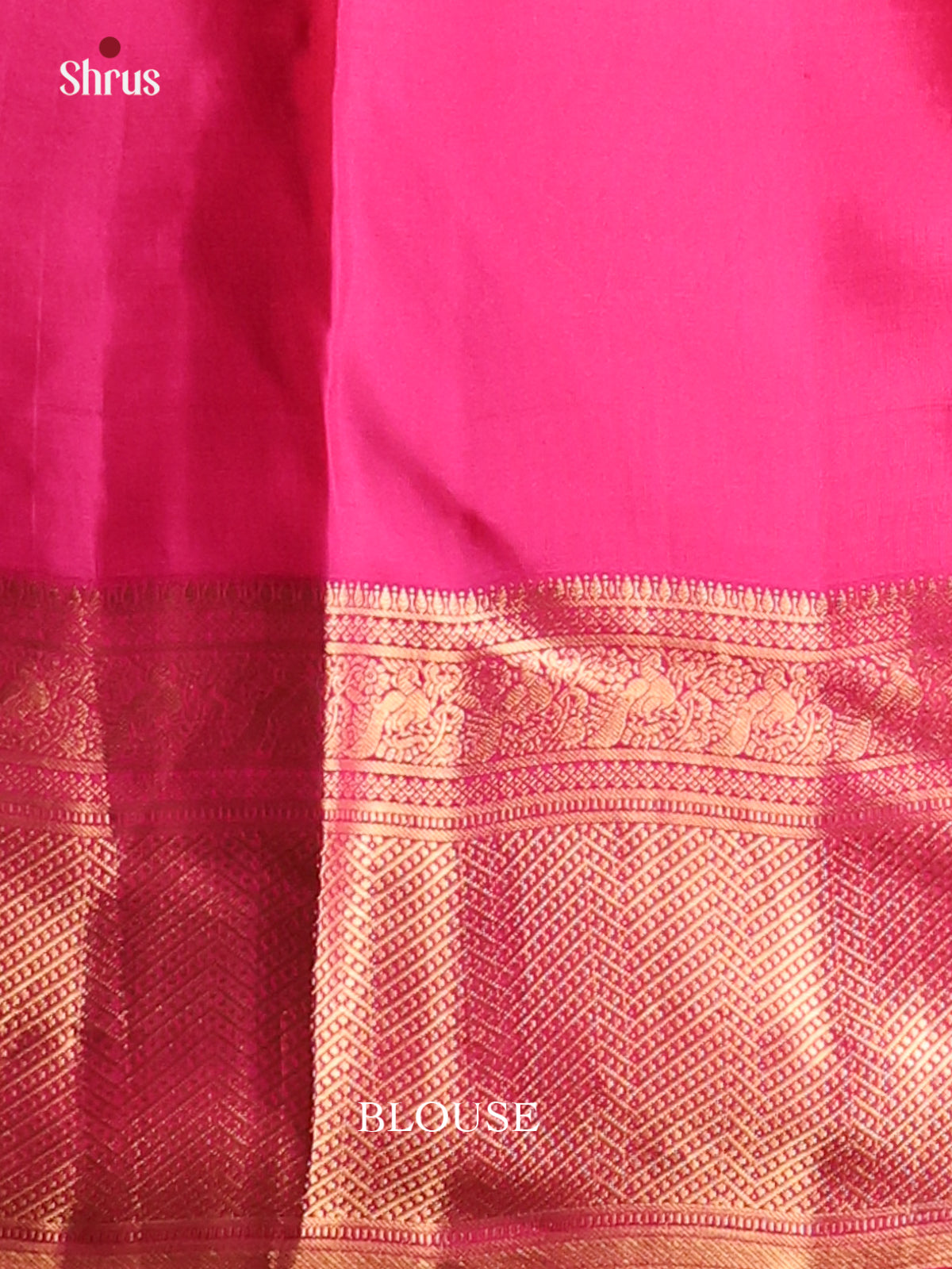 The opulent pink pallu continues the rich zari work with elaborate floral and geometric designs, adding a touch of grandeur. Crafted from pure Kanchipuram silk, this saree offers a luxurious drape. It comes with a contrast pink plain blouse with a zari border. Perfect to buy Pure Kanchipuram silk sarees online, this exquisite piece is ideal for weddings and festive occasions. Explore our stunning collection of Kanjivaram sarees.