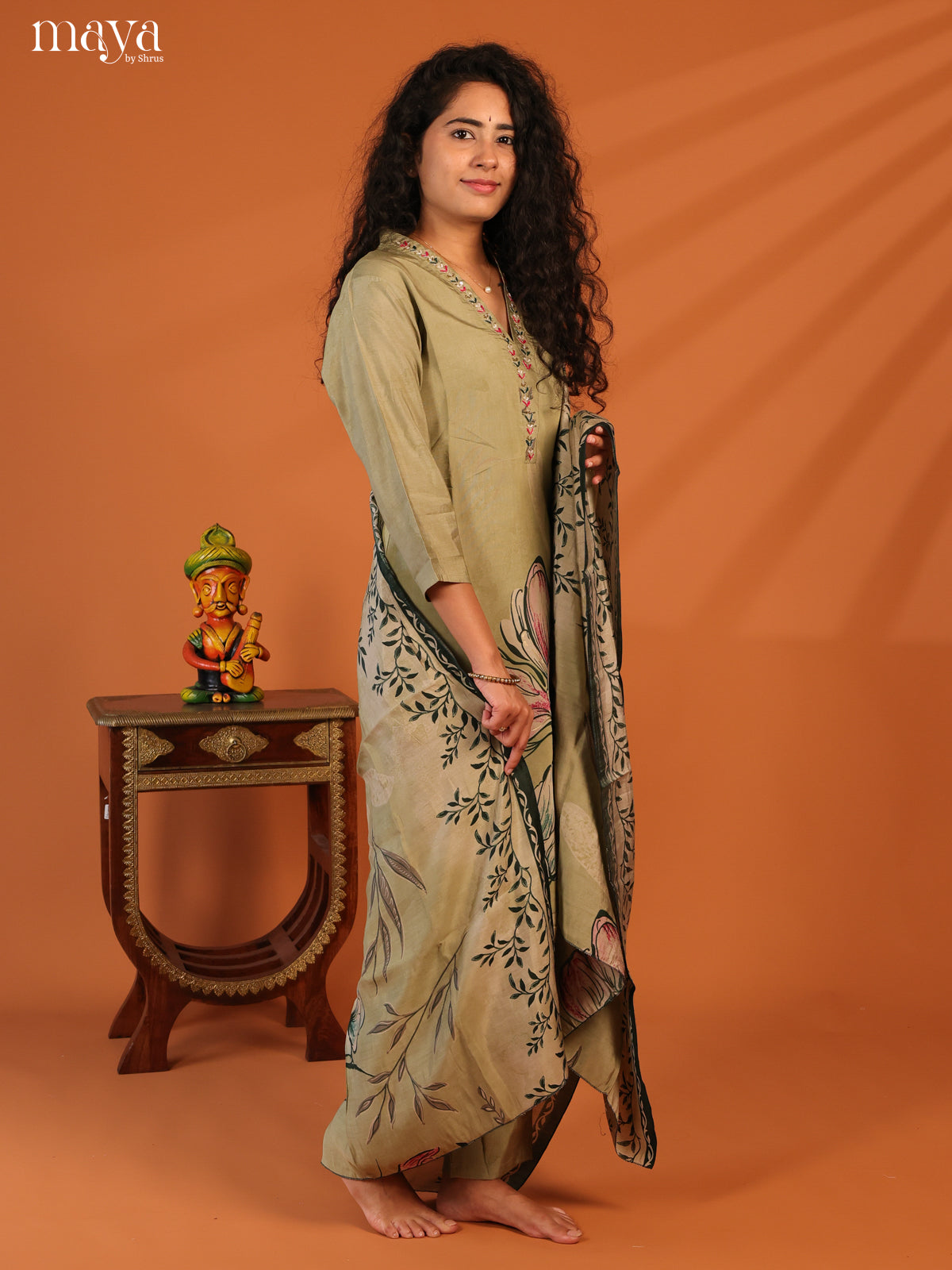 Green Rayon 3Pc Salwar Suit with Floral Print - Top, Bottom & Dupatta