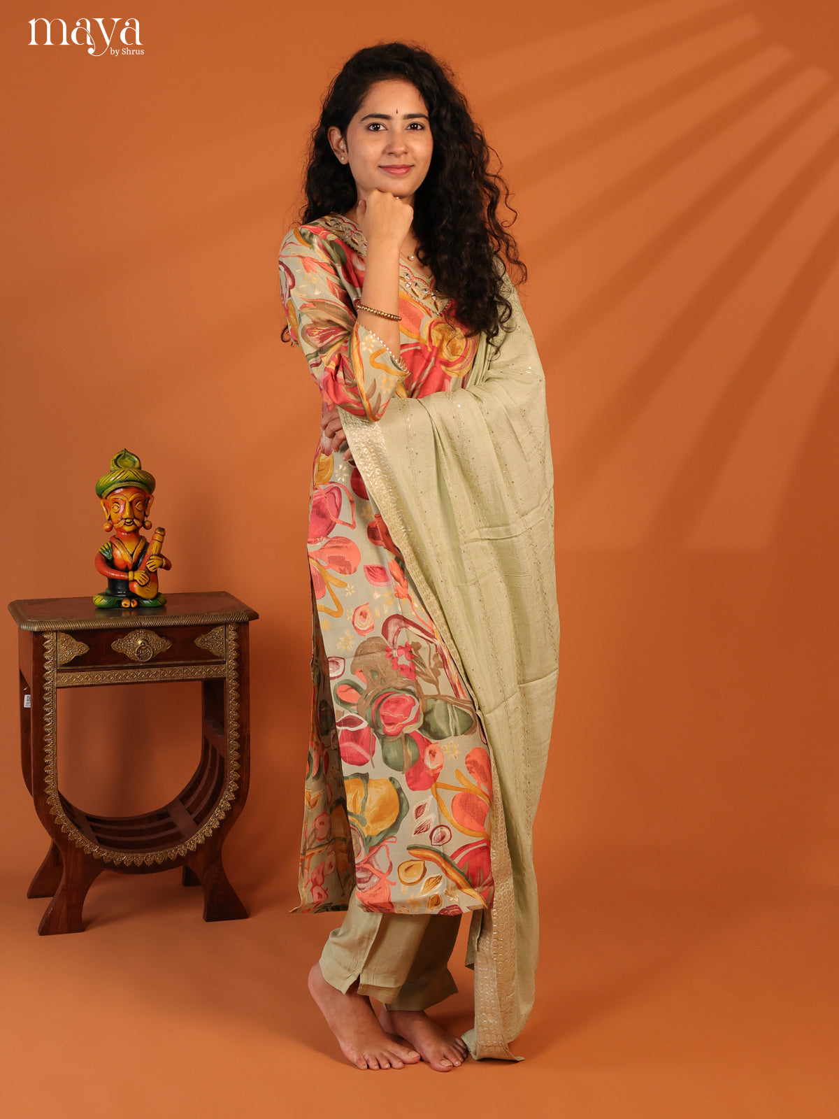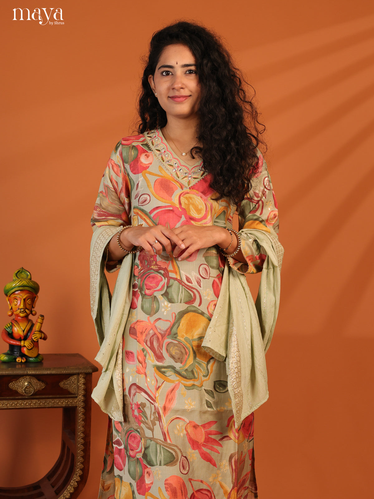 Green Linen Cotton 3Pc Salwar Suit With Floral Print - Top, Bottom & Dupatta