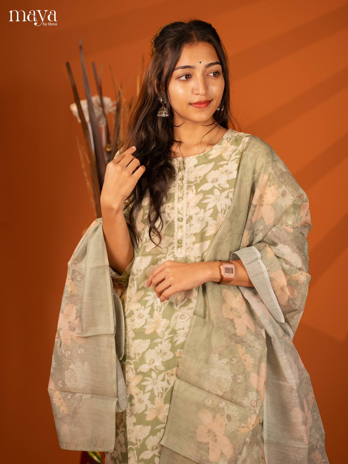 Green Rayon 3Pc Salwar With Floral Print - Top, Bottom & Dupatta