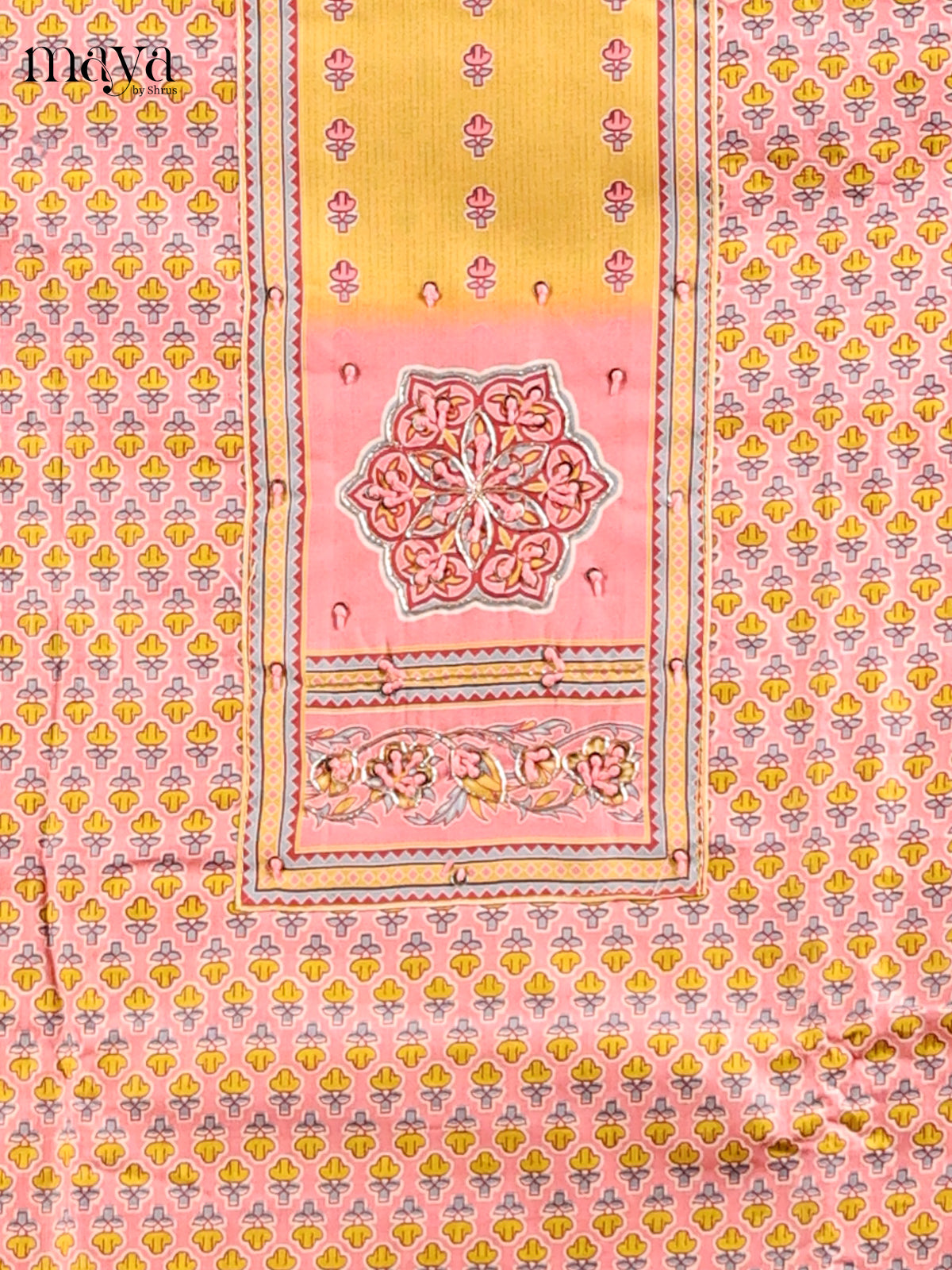 Pretty Pink, Yellow Cotton salwar adds a touch of beauty to any ensemble with its lovely floral print , neck yoke and complementary self bottom and Yellow dupatta. Made with high-quality cotton, this unstitched suit is perfect for any fashion-forward individual.