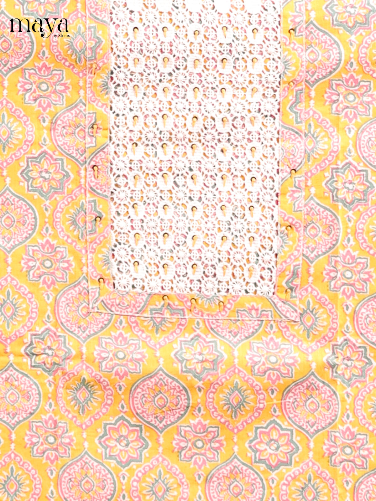 Beautiful Yellow ,Pink Cotton salwar adds a touch of beauty to any ensemble with its lovely floral print , neck yoke and complementary self bottom and Cream dupatta. Made with high-quality cotton, this unstitched suit is perfect for any fashion-forward individual.