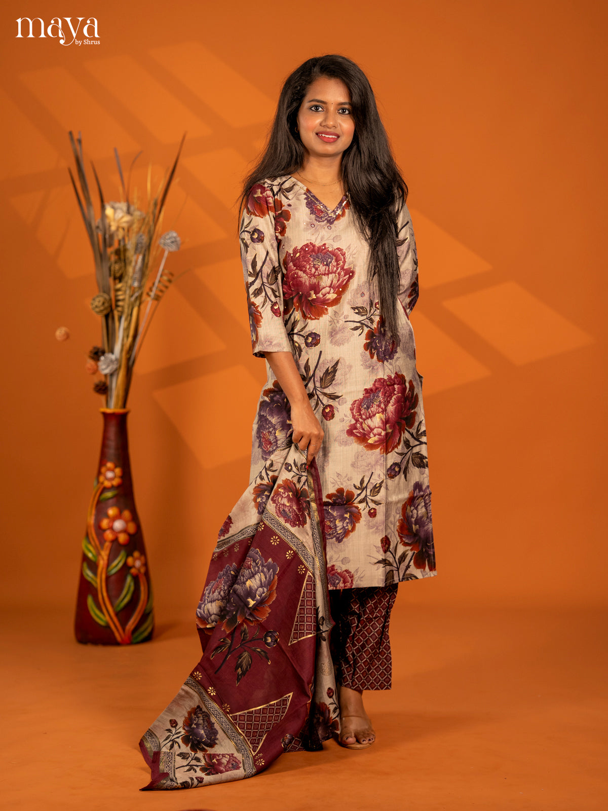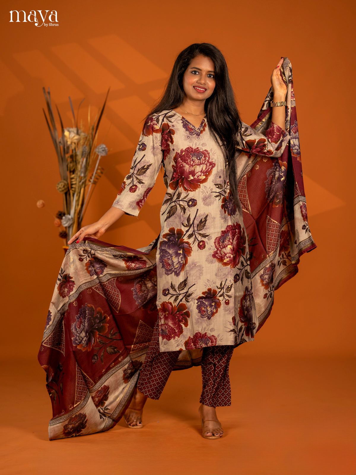 Beige with Maroon Rayon 3pc Salwar Suit with Floral Print - Top, Bottom & Dupatta