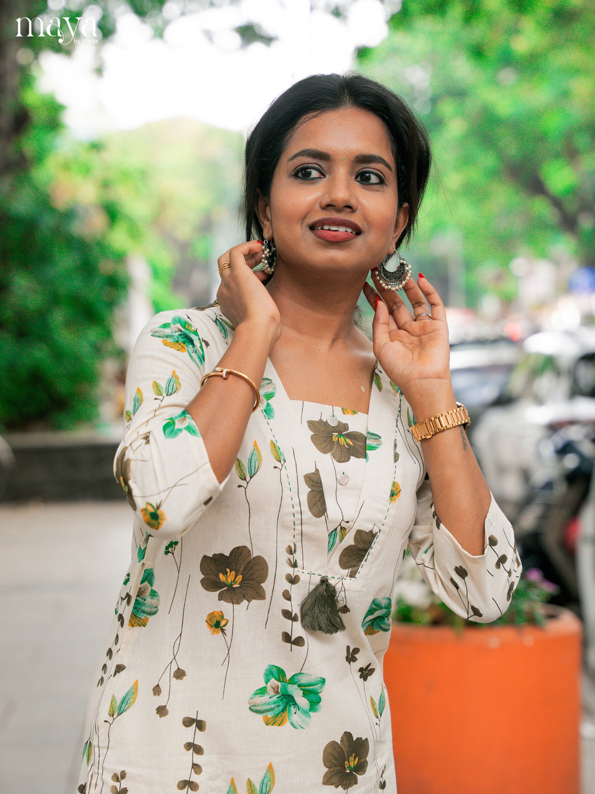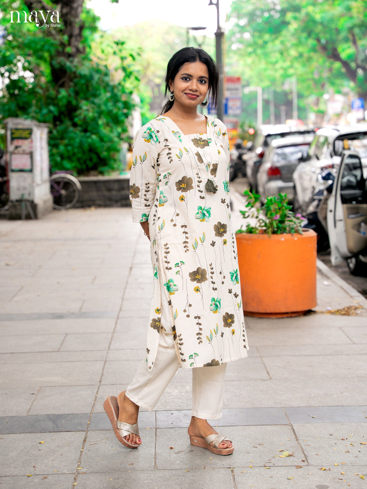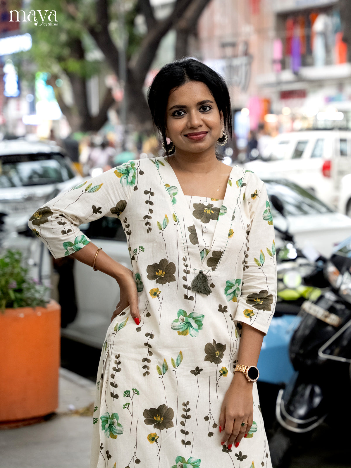 Cream Cotton 2Pc Floral Print Salwar Suit - Top & Bottom