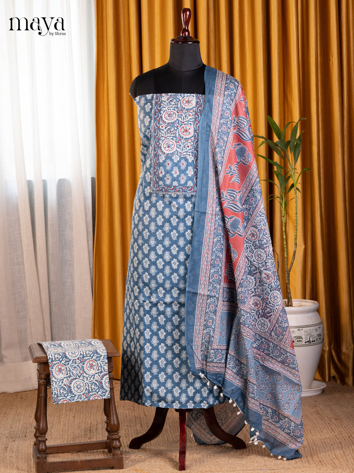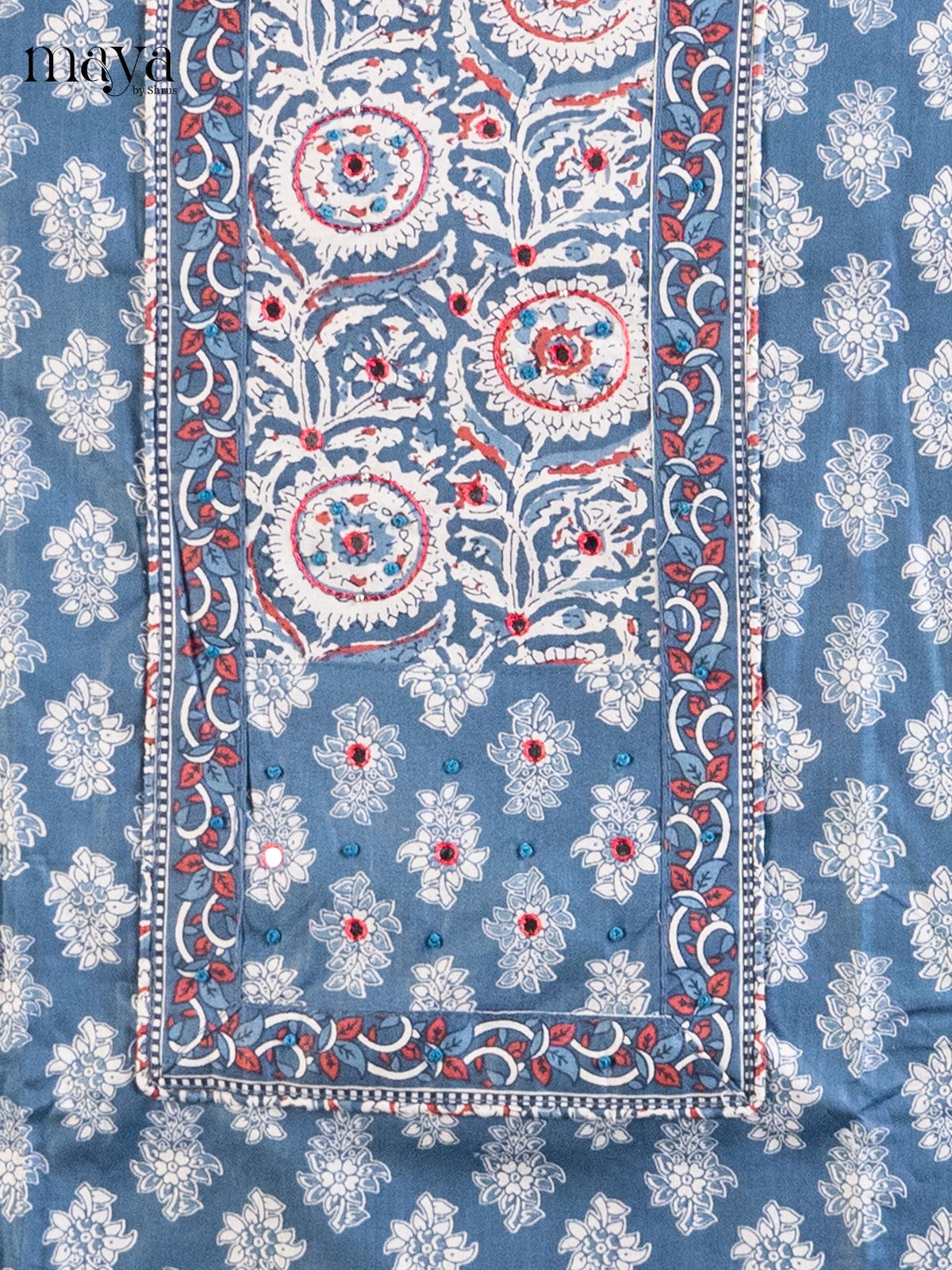 Pretty Blue & White Cotton salwar adds a touch of beauty to any ensemble with its lovely floral print ,neck yoke and complementary self bottom and dupatta. Made with high-quality cotton, this unstitched suit is perfect for any fashion-forward individual