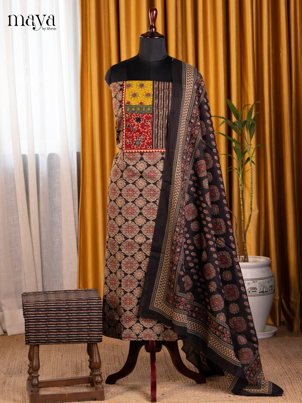 Pretty Black Cotton salwar adds a touch of beauty to any ensemble with its lovely floral print . neck yoke and complementary self bottom and dupatta. Made with high-quality cotton, this unstitched suit is perfect for any fashion-forward individual.