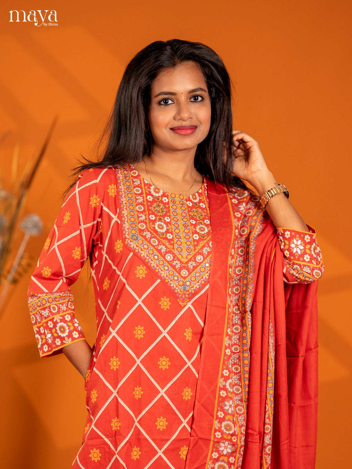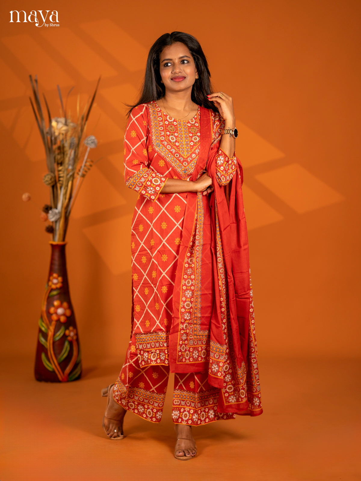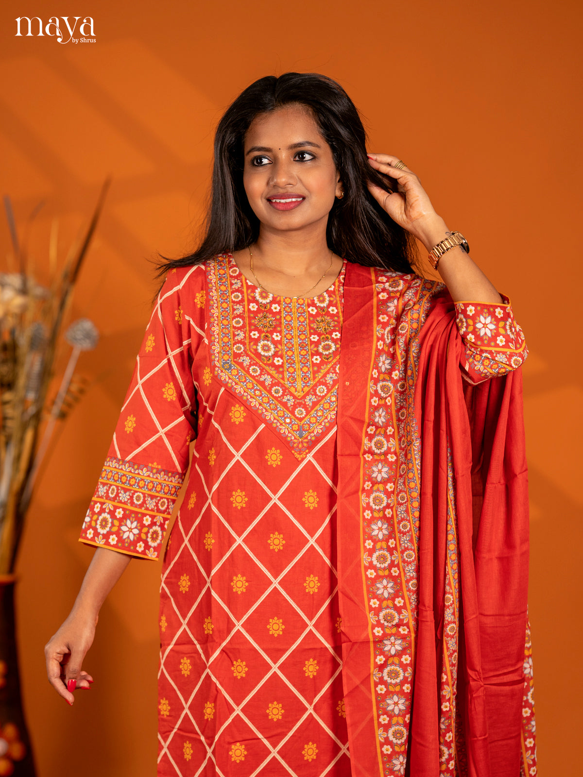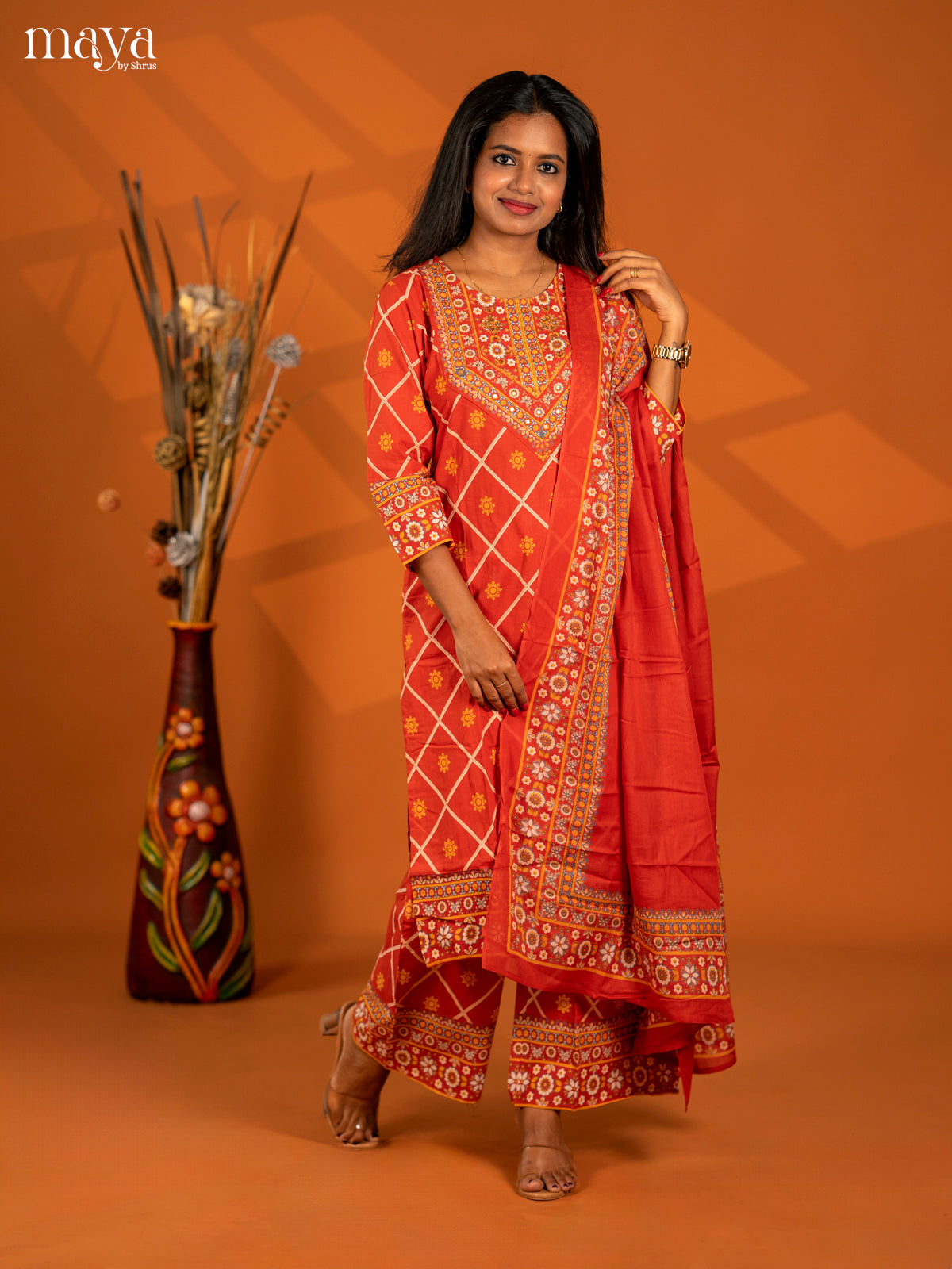 Rust Cotton 3pc Salwar Suit with Printed - Top, Bottom & Dupatta
